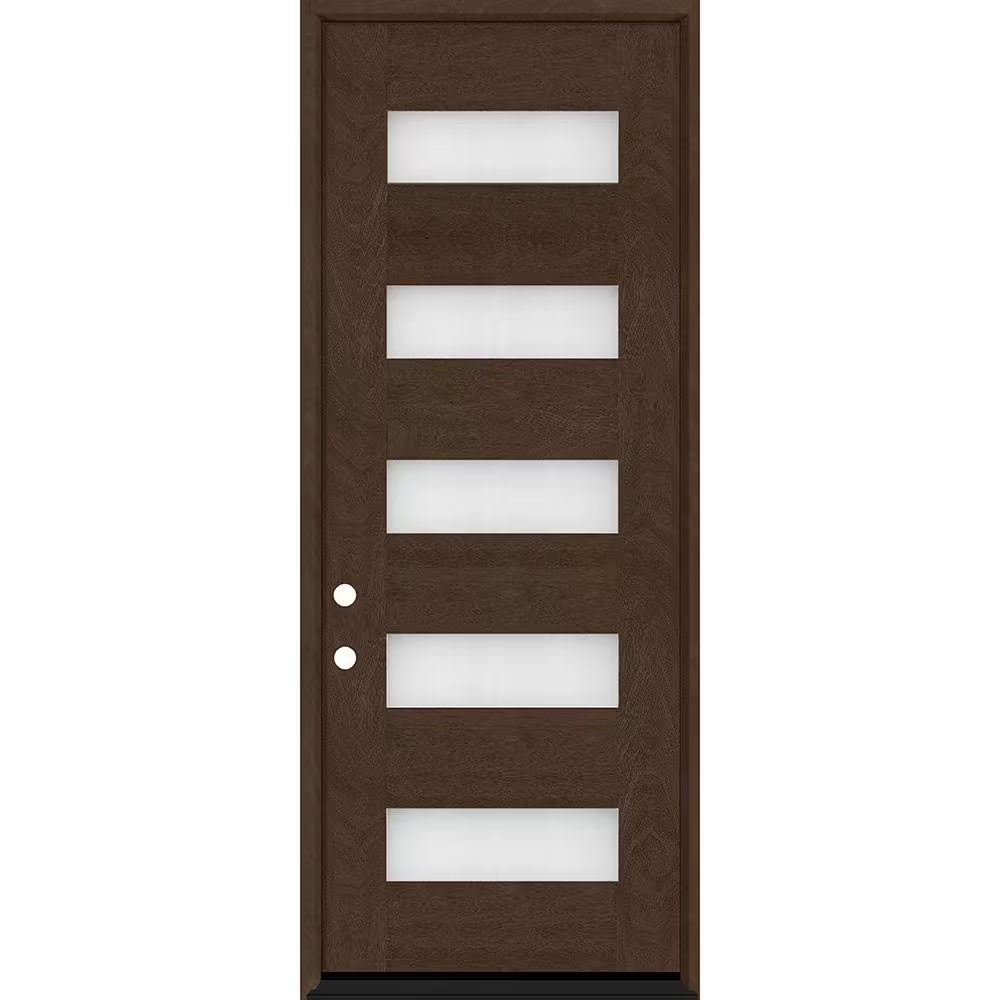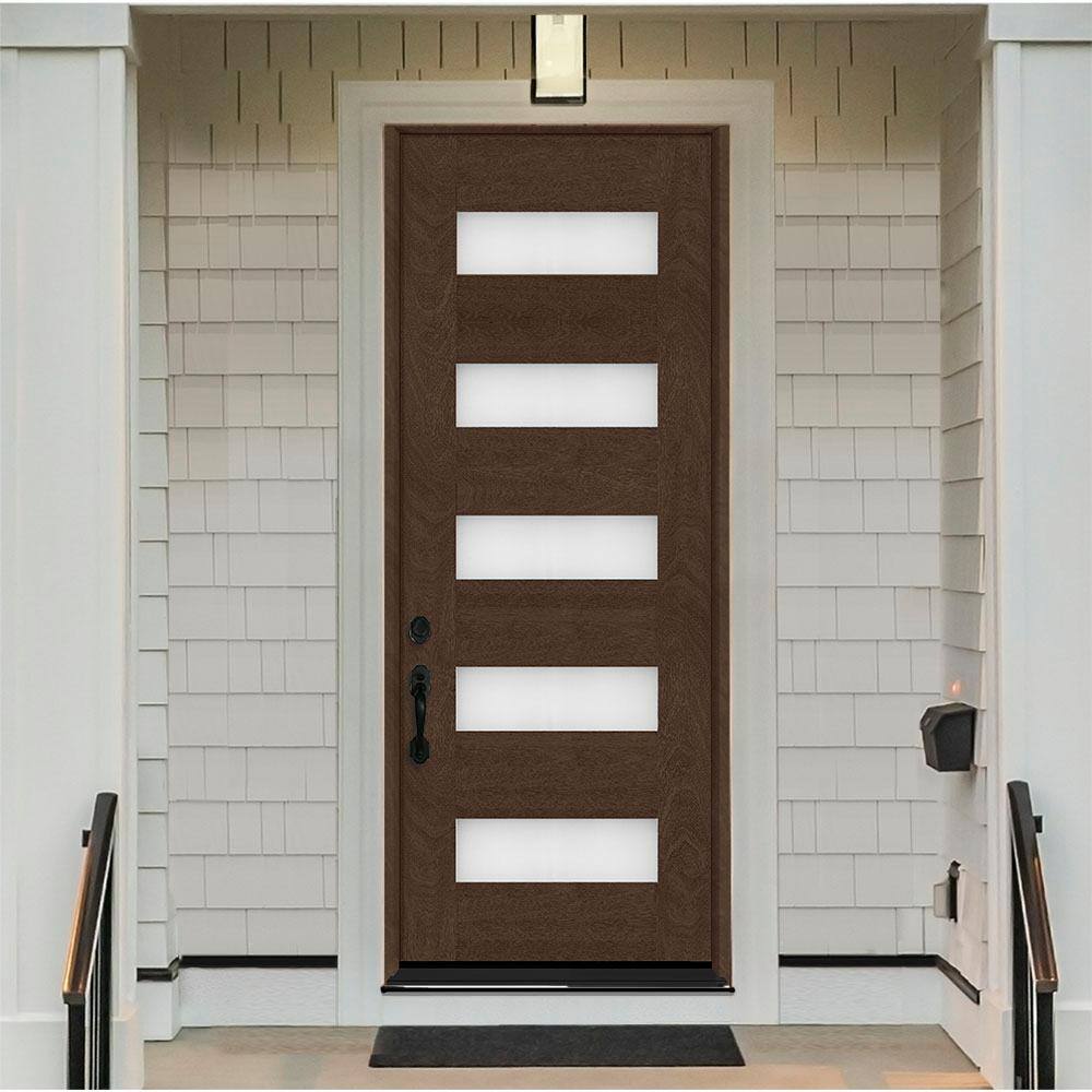 A durable, modern front door featuring frosted 5-lite glass and a hickory-stained fiberglass slab, prehung in a composite rot-free frame. Energy-efficient dual-pane glass, ball-bearing hinges, and weatherstripping deliver long-lasting performance and smooth operation.