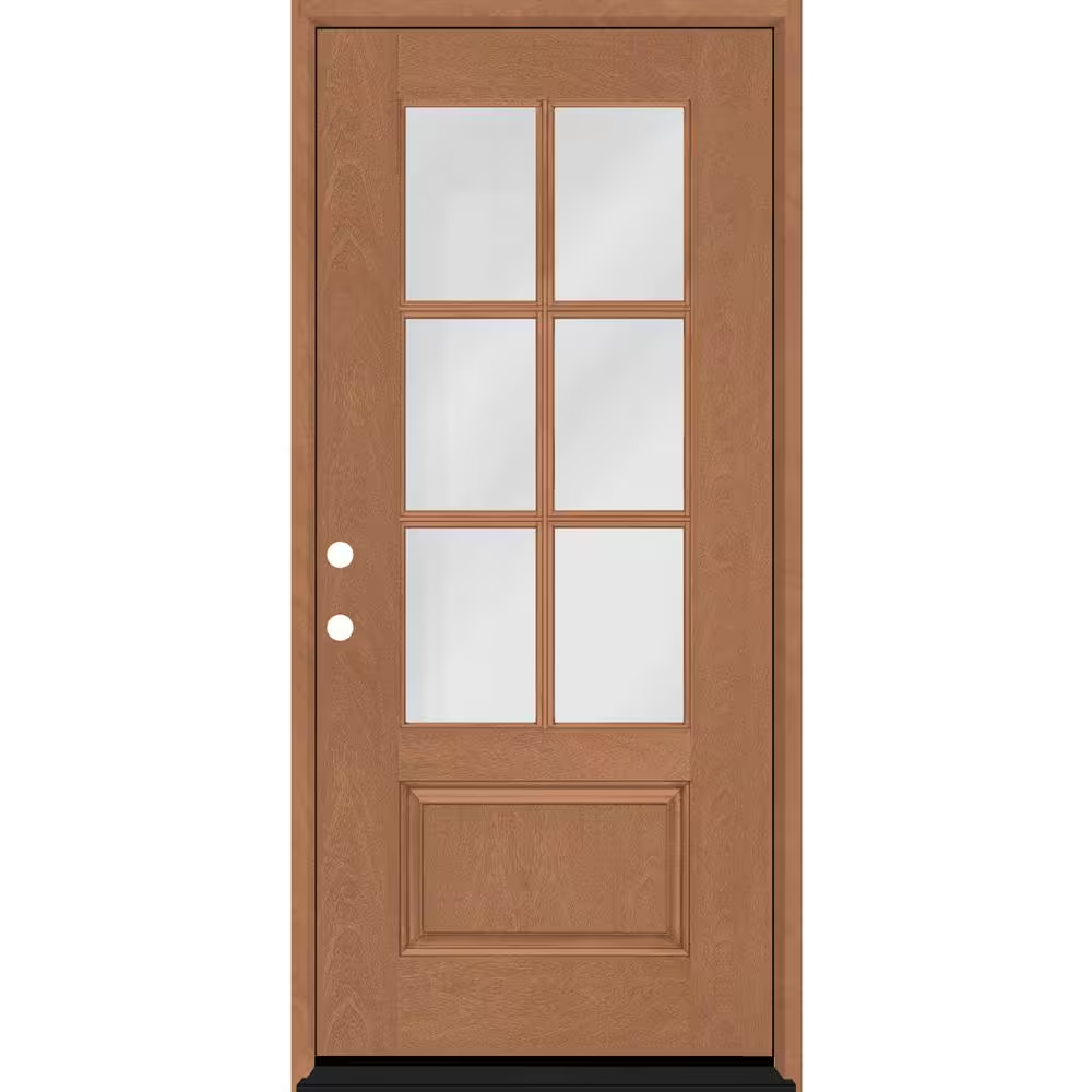 Elevate your entry with a mahogany-grain fiberglass prehung door featuring clear 3/4-6-lite direct-glazed glass. Built with a polyurethane insulated core and composite rot-free frame for energy efficiency, durability, and smooth operation.