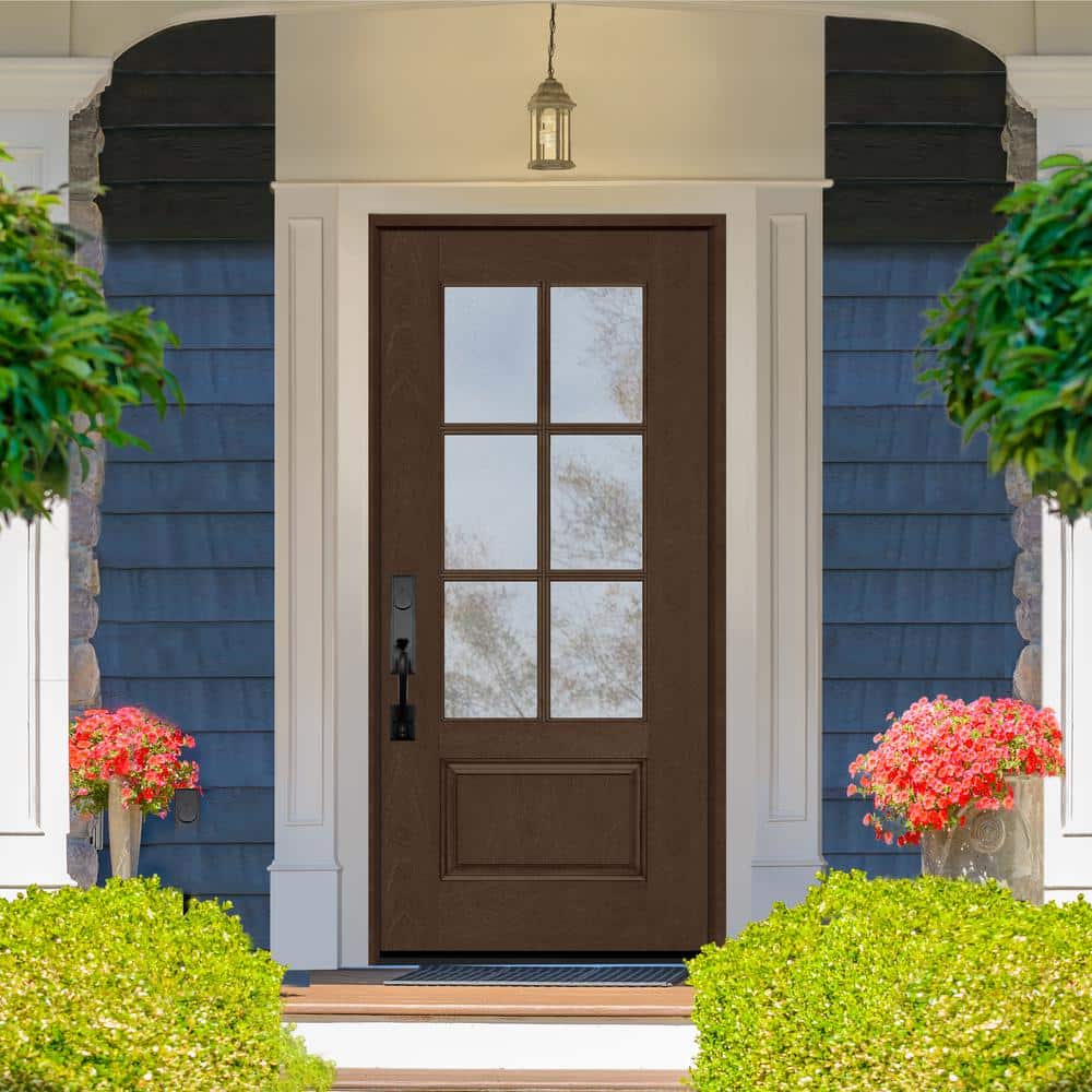 This Steves & Sons Regency exterior prehung door pairs a mahogany-grain fiberglass slab with 3/4-6 lite clear, dual-pane glass to brighten your entry while boosting energy efficiency. A composite, stain-grade frame creates a rot-free, weather-resistant system with ball-bearing hinges for smooth operation and long-term durability.