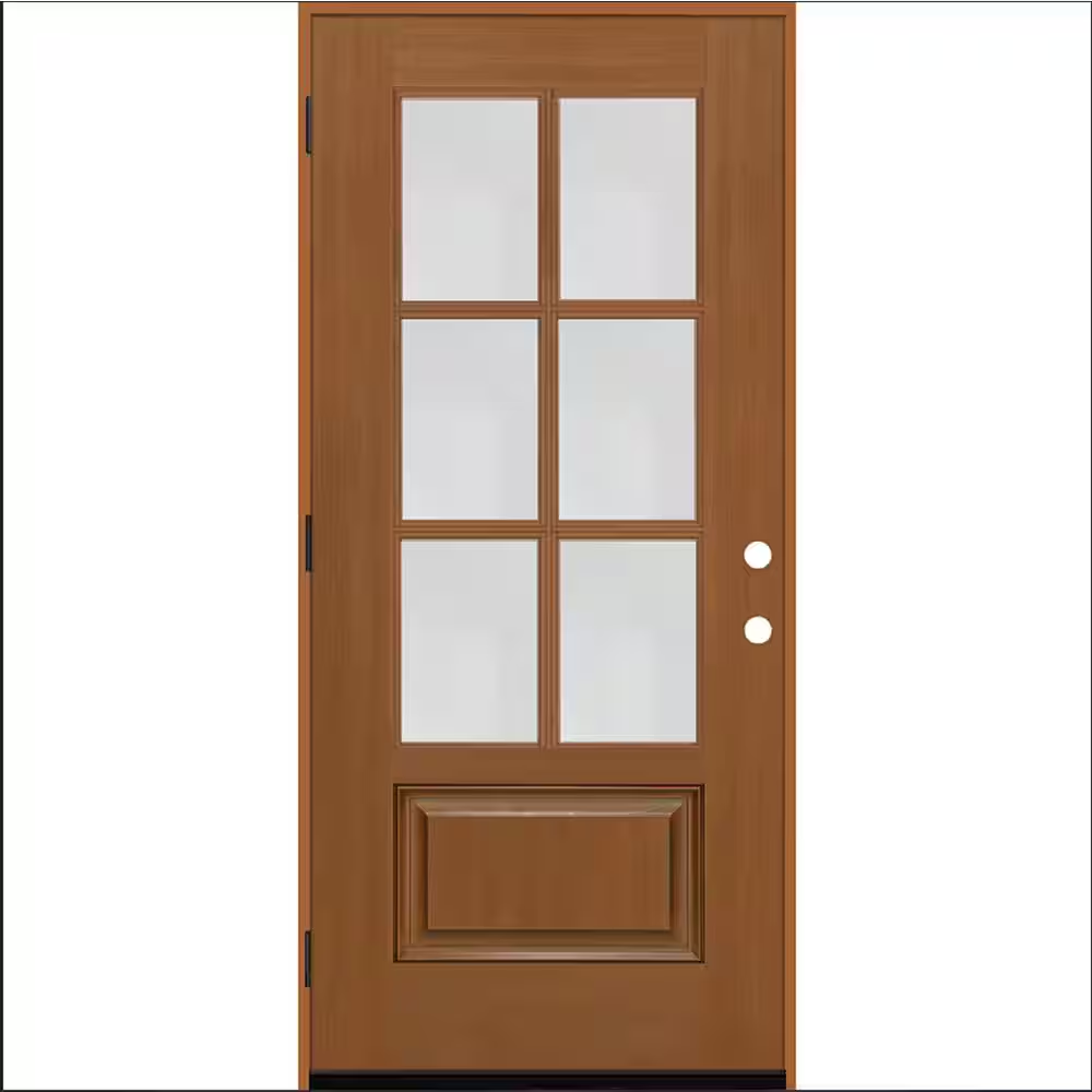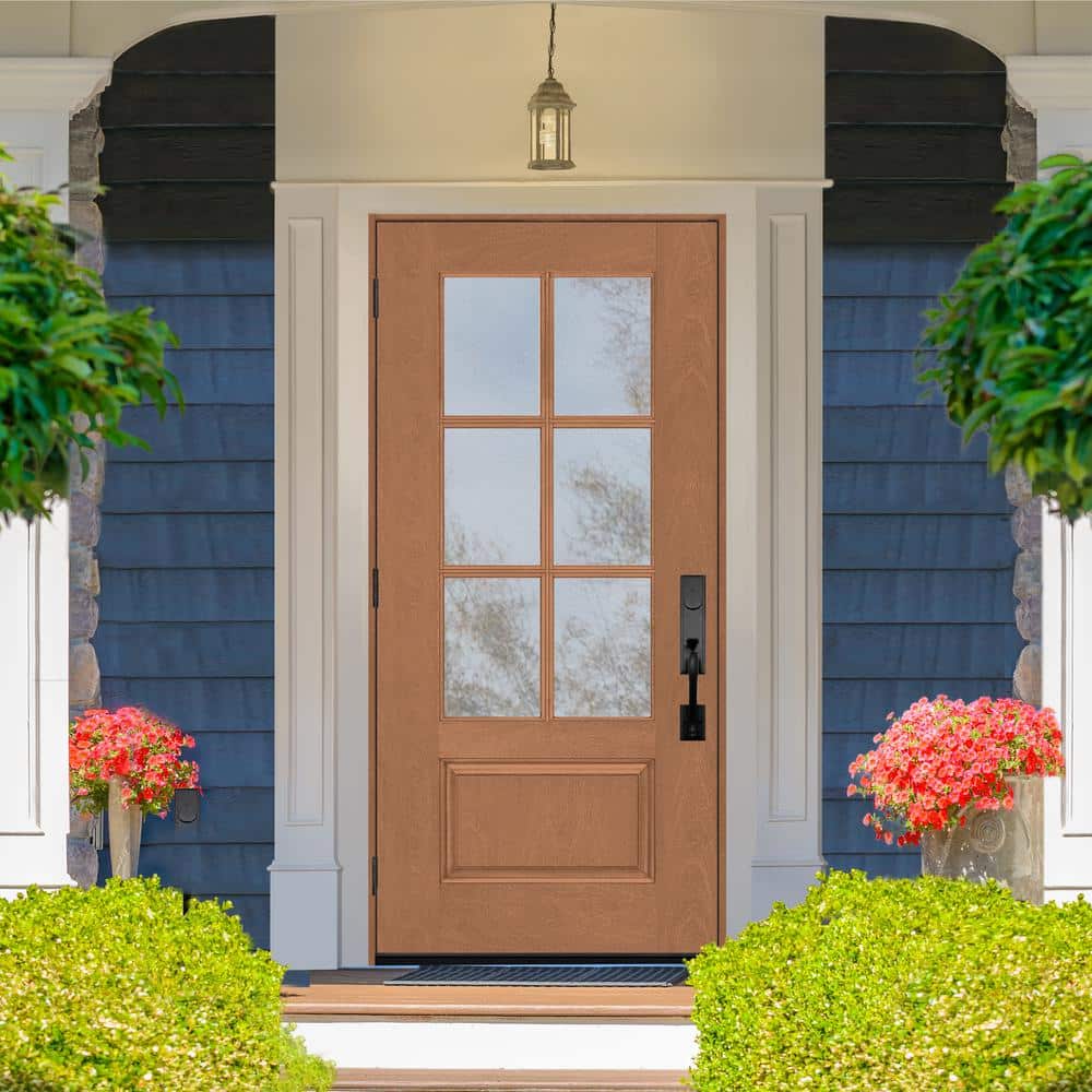 This door invites a welcoming glow, pairing a rich mahogany-grain finish with crisp six-lite clear glass for an elegant, tailored facade. The SDL detailing reads classic yet fresh, elevating curb appeal with refined proportion. Style it with matte black hardware and layered planters to accentuate the warm Autumn Wheat stain. A chic, resilient entry—essential for luxurious everyday living.