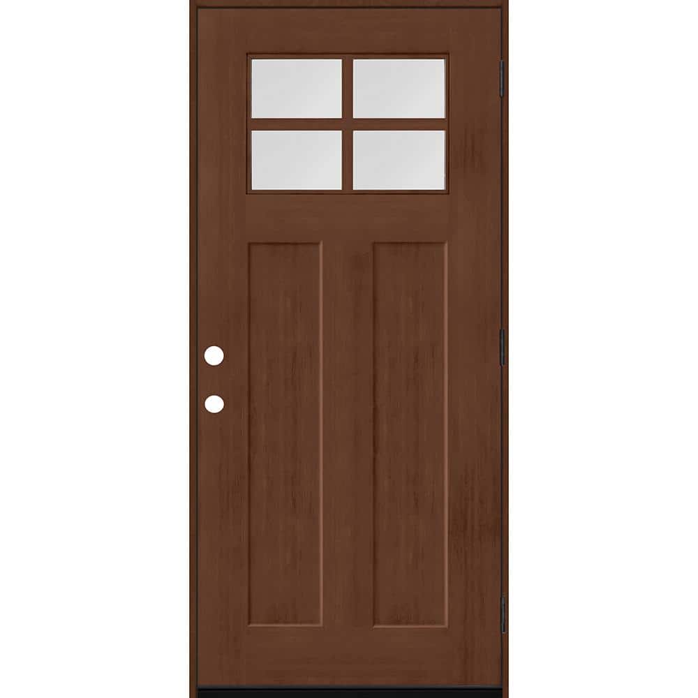 This chestnut-stained fir-grain door brings a timeless, Craftsman sensibility to the entry, washed in natural light through its crisp four-lite window. The direct-glazed SDL glass reads bespoke and tailored, lending the facade a polished, architectural note. Pair it with matte black hardware and creamy trim to heighten the contrast and sophistication. It’s an elegant essential that marries beauty with durability for luxurious everyday living.