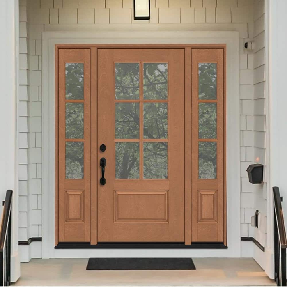 This mahogany-grain fiberglass entryway washes your foyer in gentle light, creating a gracious first impression. The Autumn Wheat stain and six-lite design evoke classic craftsmanship with modern resilience. Style it with matte black hardware and a textured runner to accentuate the clean, divided lites. A luxurious yet practical centerpiece, it anchors the facade with enduring elegance.