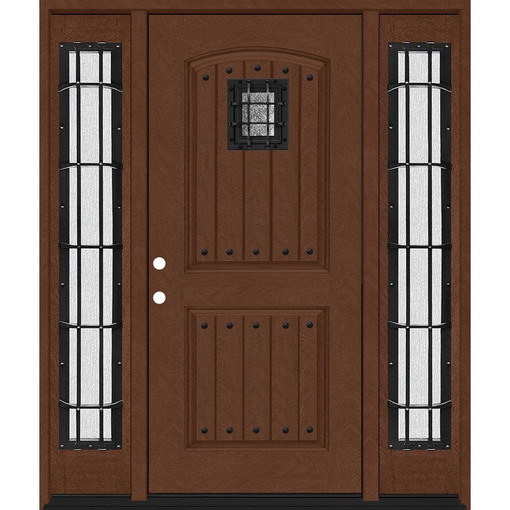Crafted from durable fiberglass with a polyurethane core, this prehung Regency door delivers the rustic charm of a 2-panel plank design with an operable speakeasy. Finished in Chestnut with rain glass sidelites and bronze hardware accents, it arrives in a composite, weather-stripped frame for energy-efficient performance and easy installation.