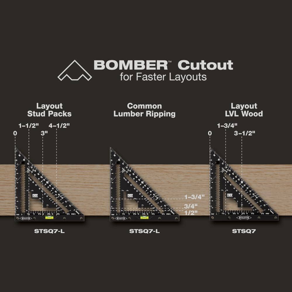 Q: How does the BOMBER Cutout improve my work efficiency? A: The BOMBER Cutout provides precise, repeatable measurements for stud layouts, which speeds up framing tasks and improves accuracy.