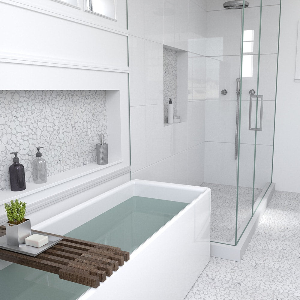 A honed, Carrara-look pebble mosaic made from recycled glass, delivering the beauty of marble with superior durability. Mesh-mounted for easy installation, this waterproof, stain-resistant tile suits floors and walls indoors or outdoors.