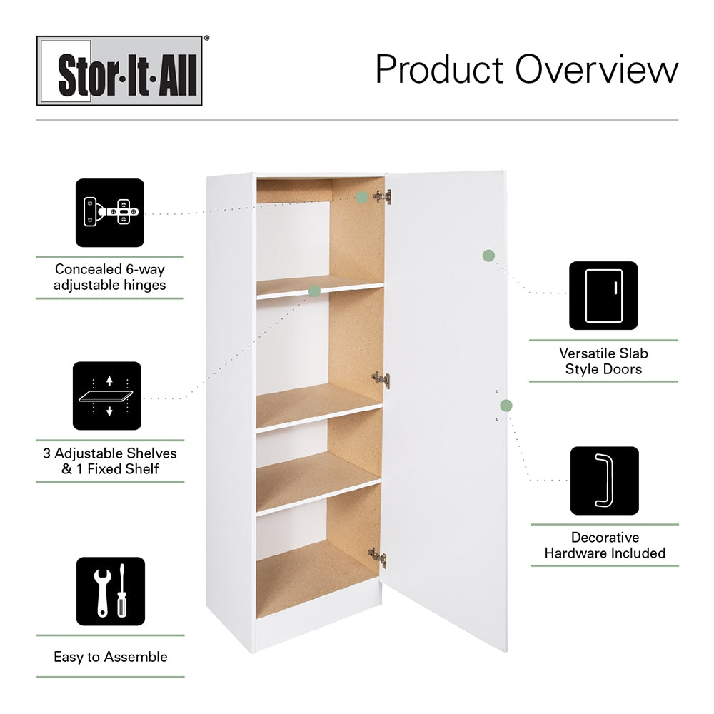 Maximize your space with the Stor-It-All Wall-Mount Utility Storage Cabinet. This versatile, wood composite cabinet offers flexible storage with adjustable shelves and a sleek, durable white finish to blend seamlessly with any decor. Perfect for kitchens, bathrooms, garages, or anywhere you need organized, handy storage.