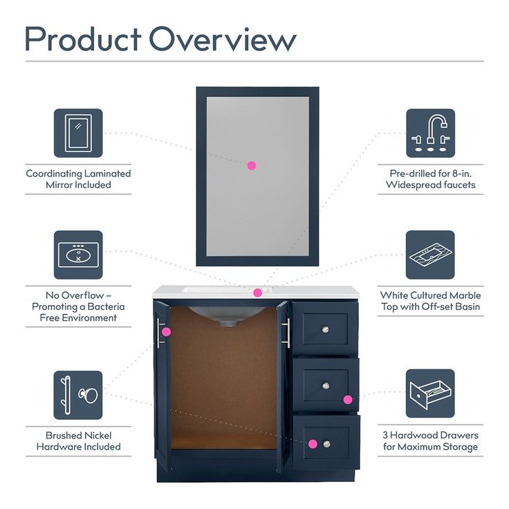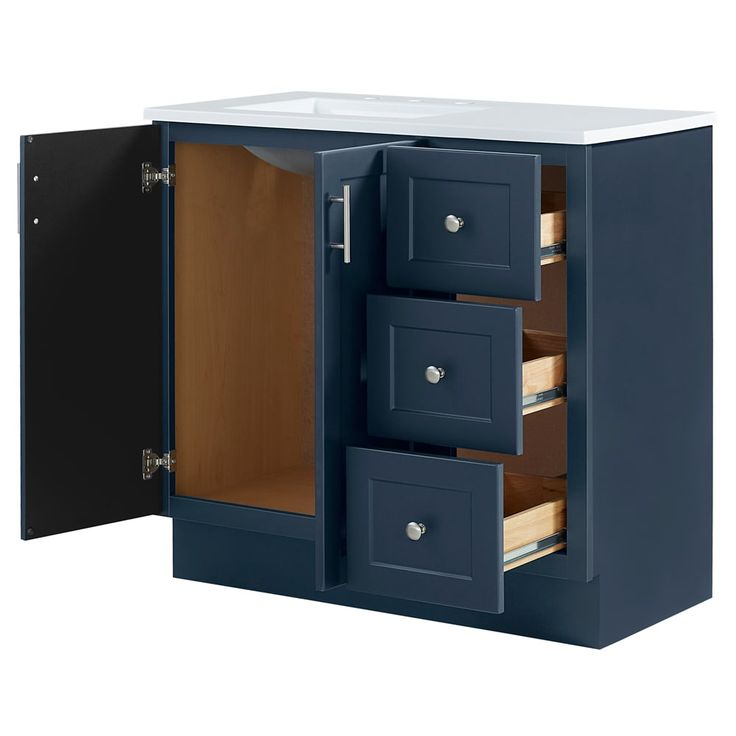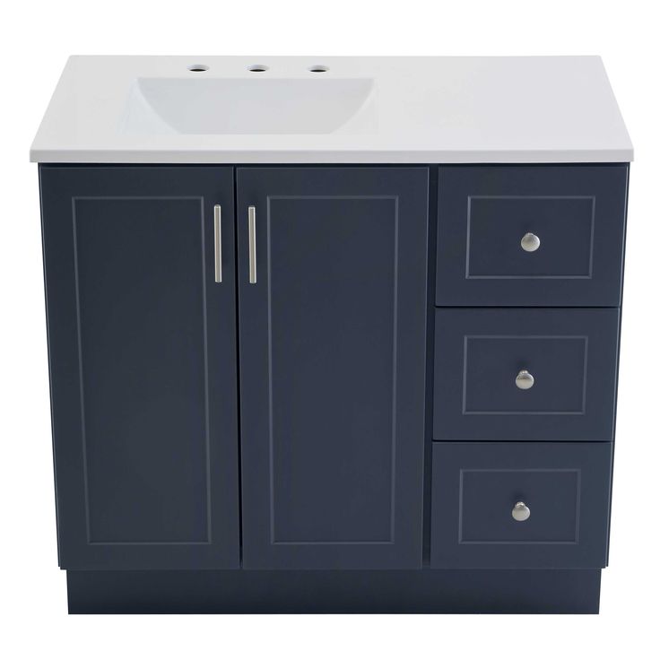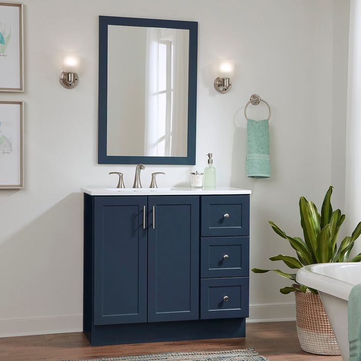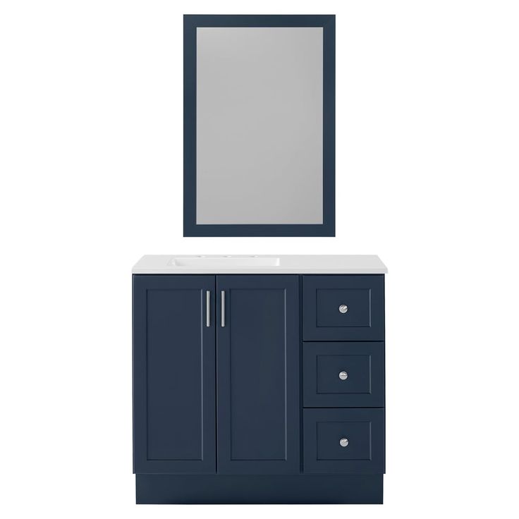 Upgrade your bathroom with the Style Selections Davies 36-in Navy Single Sink Vanity. The sleek navy finish and white cultured marble top add a touch of elegance, while the included mirror provides convenience. Transform your space with this stylish and functional addition.