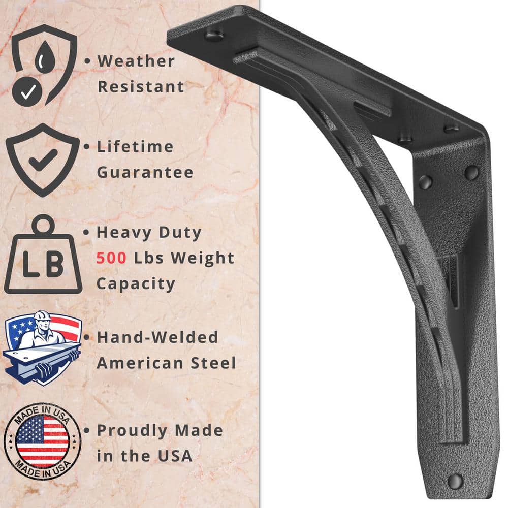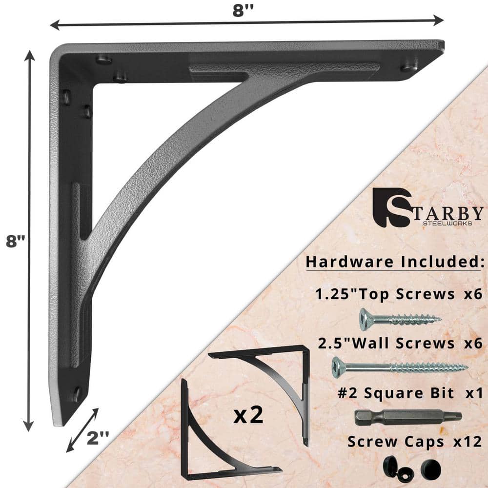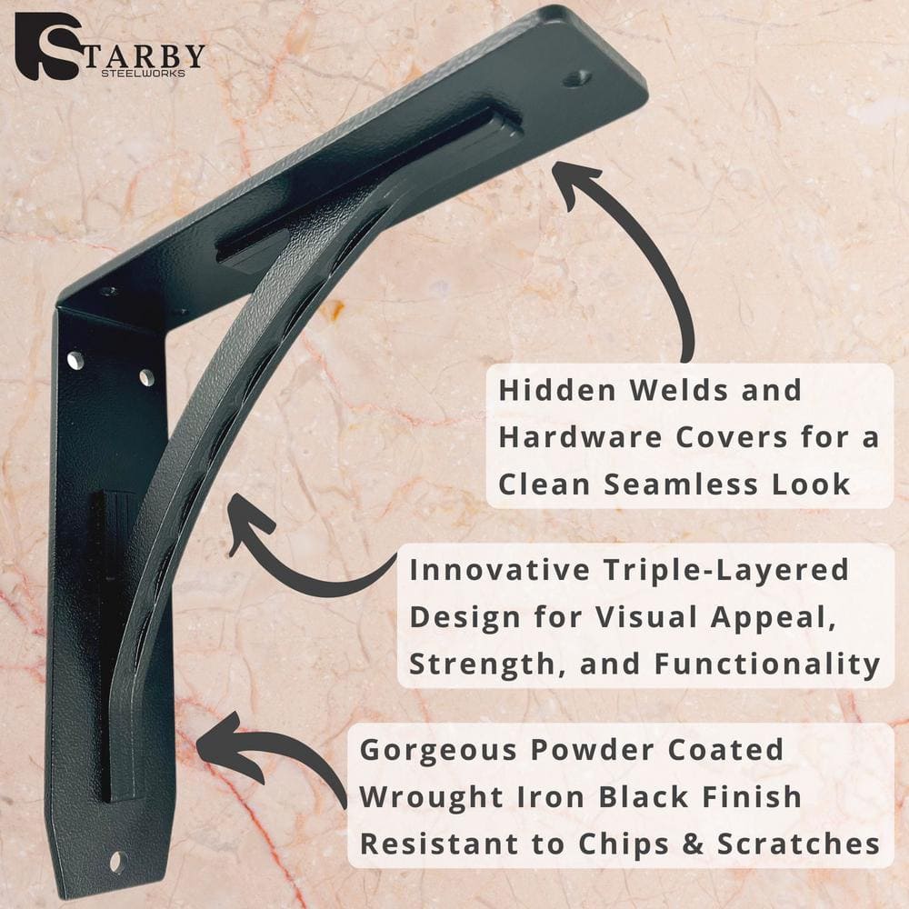 The Starby Sullivan 8-inch shelf brackets are expertly crafted from premium American welded steel, offering both robust support and striking design. Finished in a sleek textured black, these brackets are perfect for both indoor and outdoor applications, making them a versatile choice for pros and DIYers alike.
