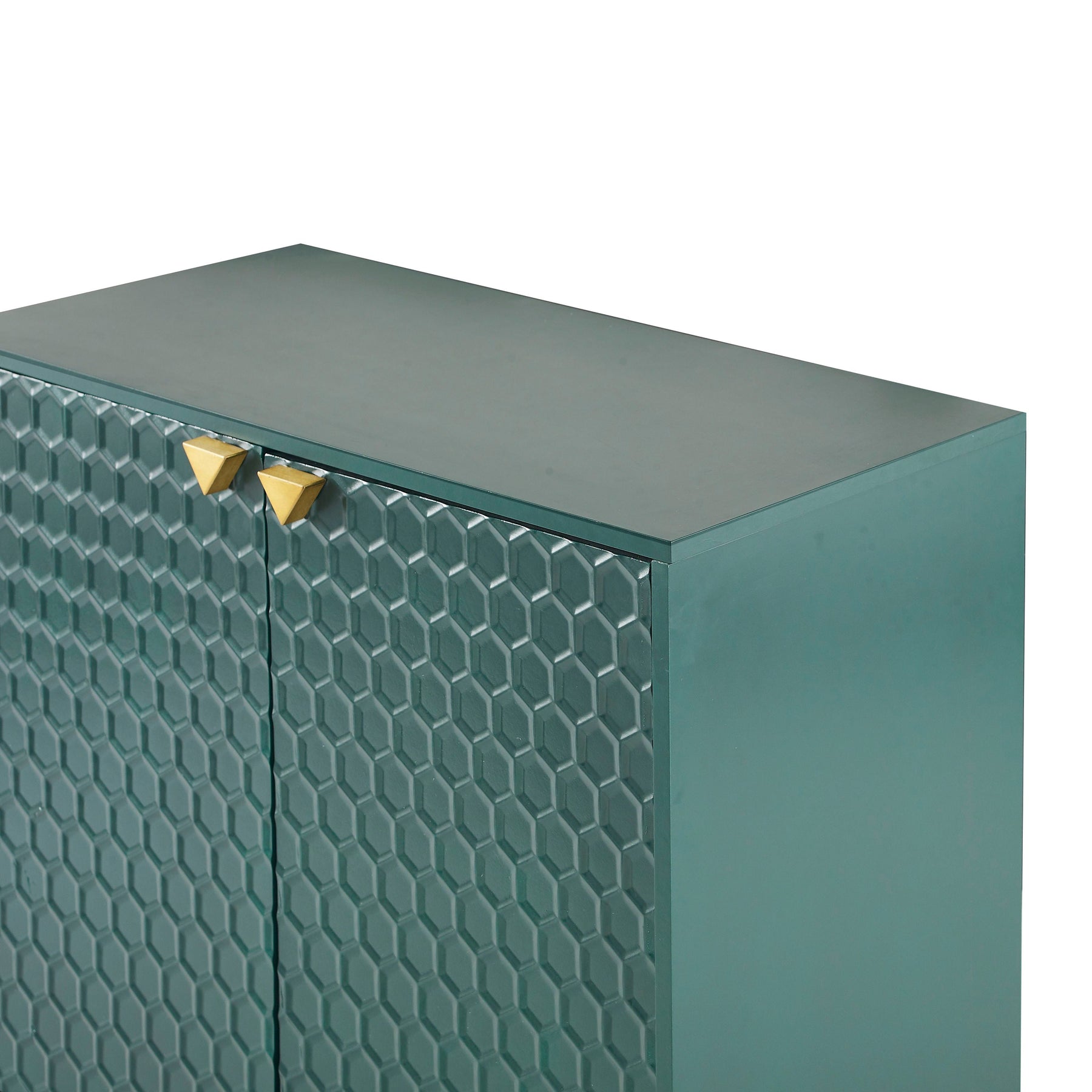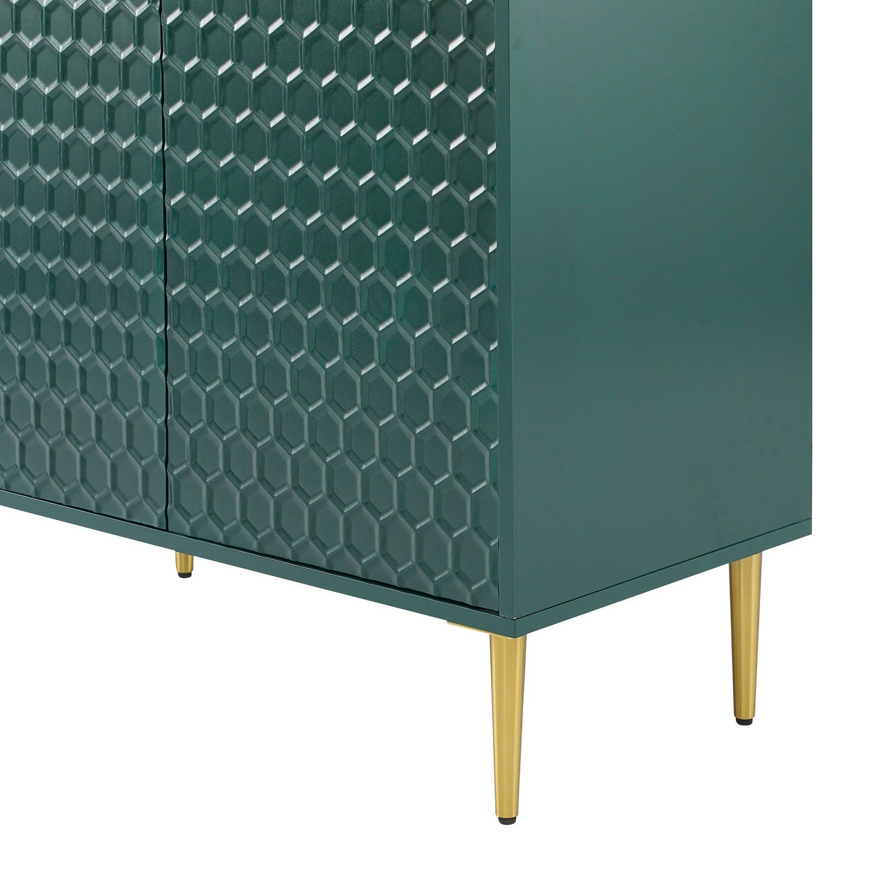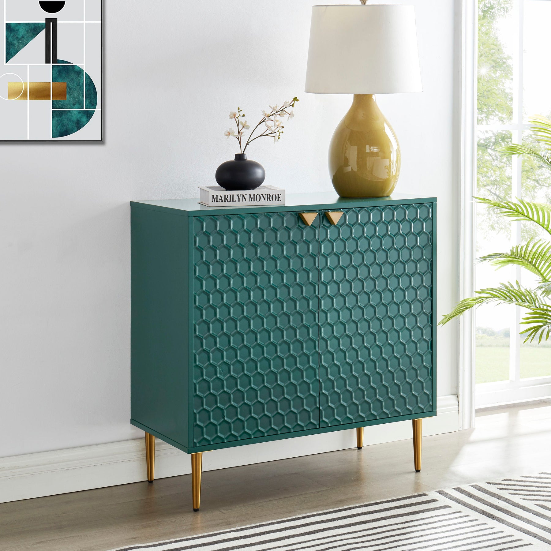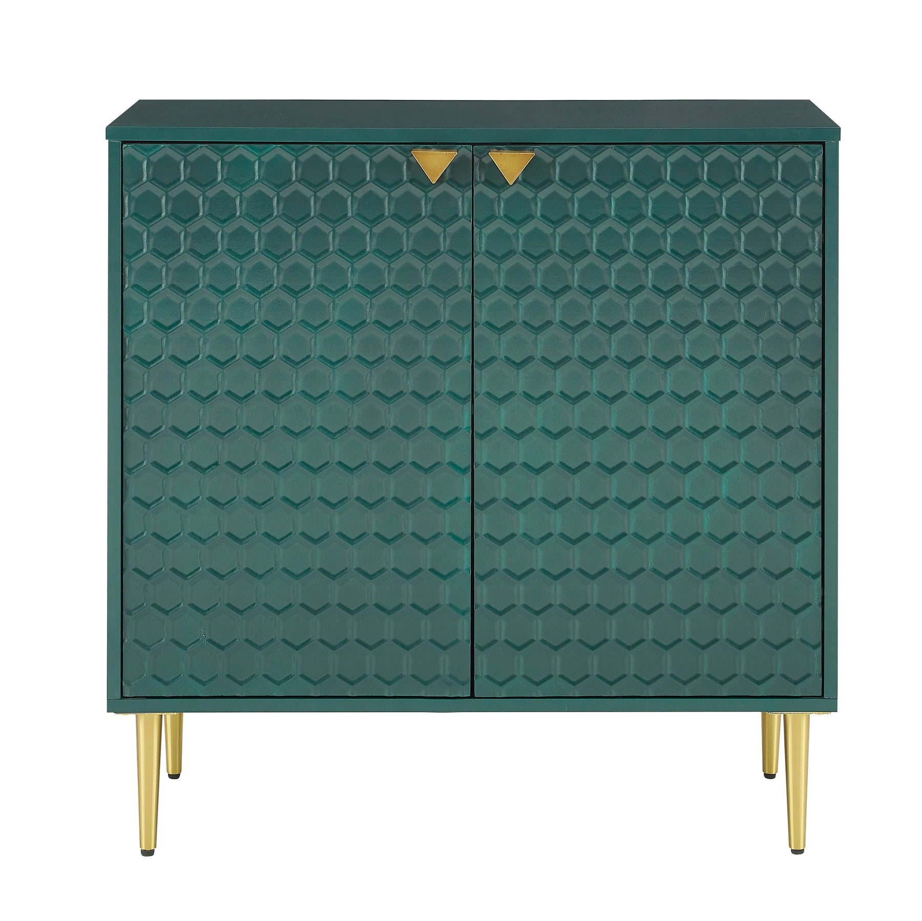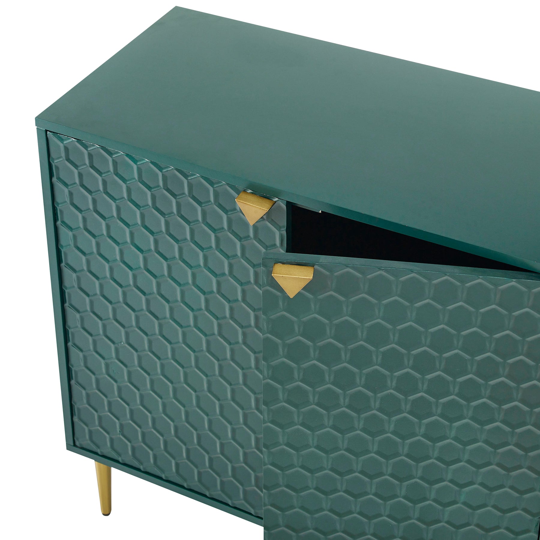Elevate your space with the Sumyeg Green Apothecary Accent Cabinet. Featuring a stunning raised honeycomb pattern and elegant gold legs, this cabinet offers both style and functionality with ample storage inside fully assembled doors.