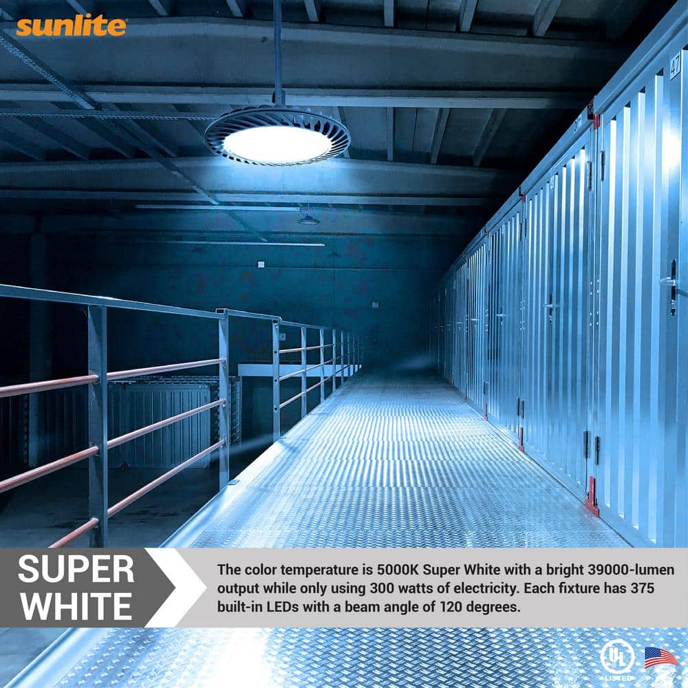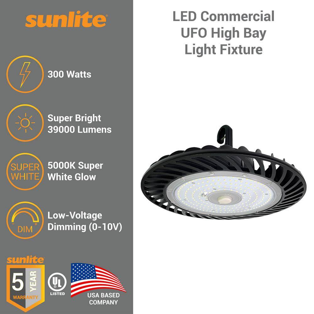 Illuminate your commercial spaces with the Sunlite 750-Watt Equivalent LED UFO High Bay Light. Delivering 39,000 Lumens of brilliant daylight (5000K) while consuming just 300 Watts, this fixture offers energy efficiency and powerful performance. Designed for wet locations and versatile voltage settings, it is UL Listed and IP65 rated, making it perfect for warehouses, workshops, and retail environments.