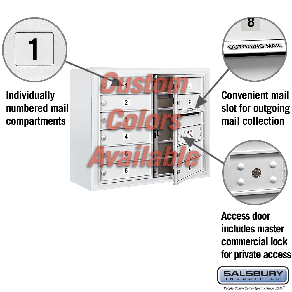 This Surface Mounted 4C Horizontal Mailbox Unit is designed for private access and features a durable aluminum construction with a powder-coated finish. It includes 10 MB1 doors, a master commercial lock, and is suitable for indoor or outdoor use.