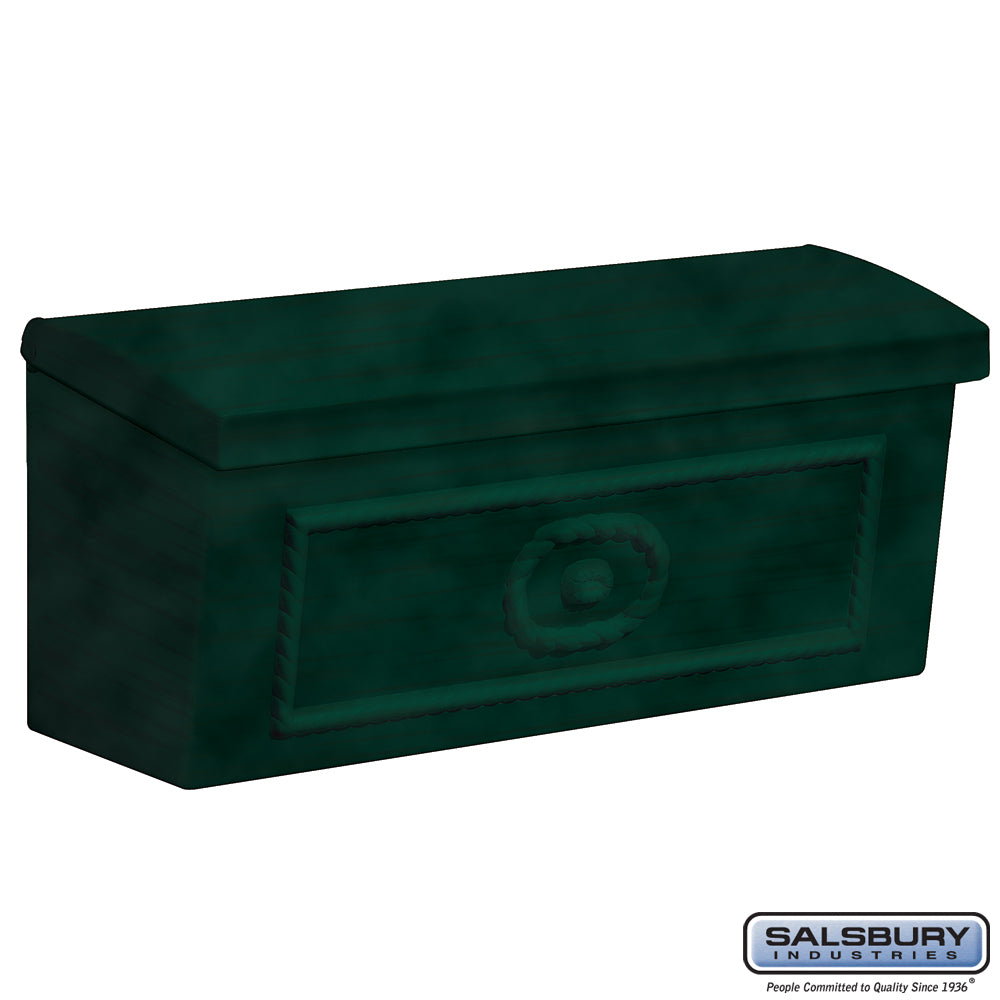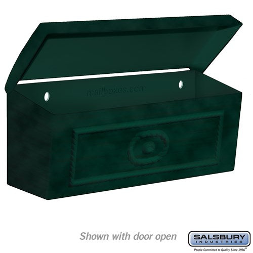 The Surface Mounted Townhouse Mailbox in green is crafted from durable die-cast aluminum with a powder-coated finish, ensuring longevity and style. Designed for U.S.P.S. residential door mail delivery, it offers a practical and elegant solution for your mail storage needs.