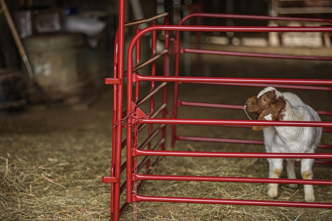 The Tarter Red Flat-top Steel Corral Gate offers a robust and versatile solution for small animal containment. Its powder-coated steel ensures durability and corrosion resistance, making it a reliable choice for enclosing goats, sheep, and other small livestock.