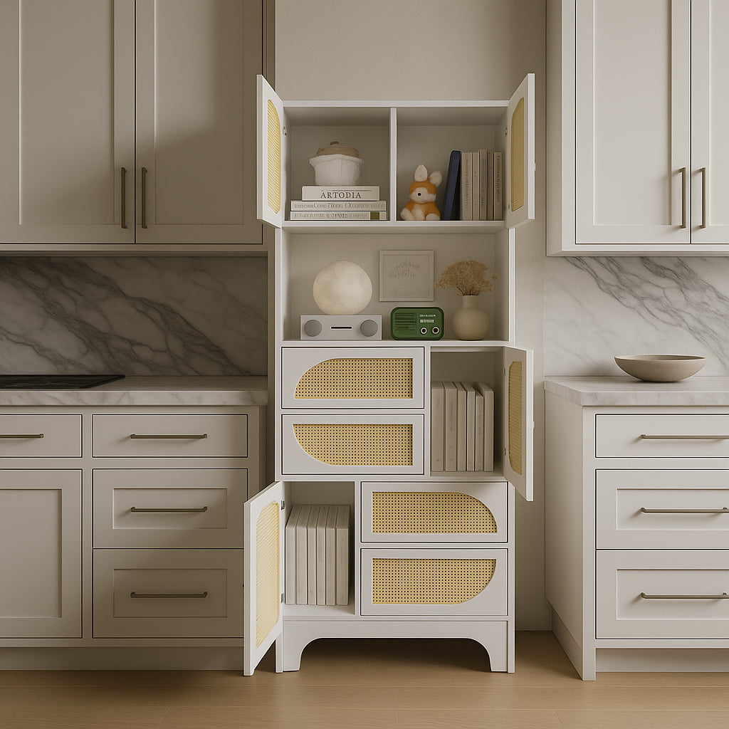 This Tatayosi cabinet transforms any room with its blend of modern design and natural warmth. The rattan doors add texture and charm, while the white finish ensures a clean, sophisticated look. Perfect for organizing essentials, it complements both contemporary and classic interiors. A must-have for creating a serene and stylish environment.
