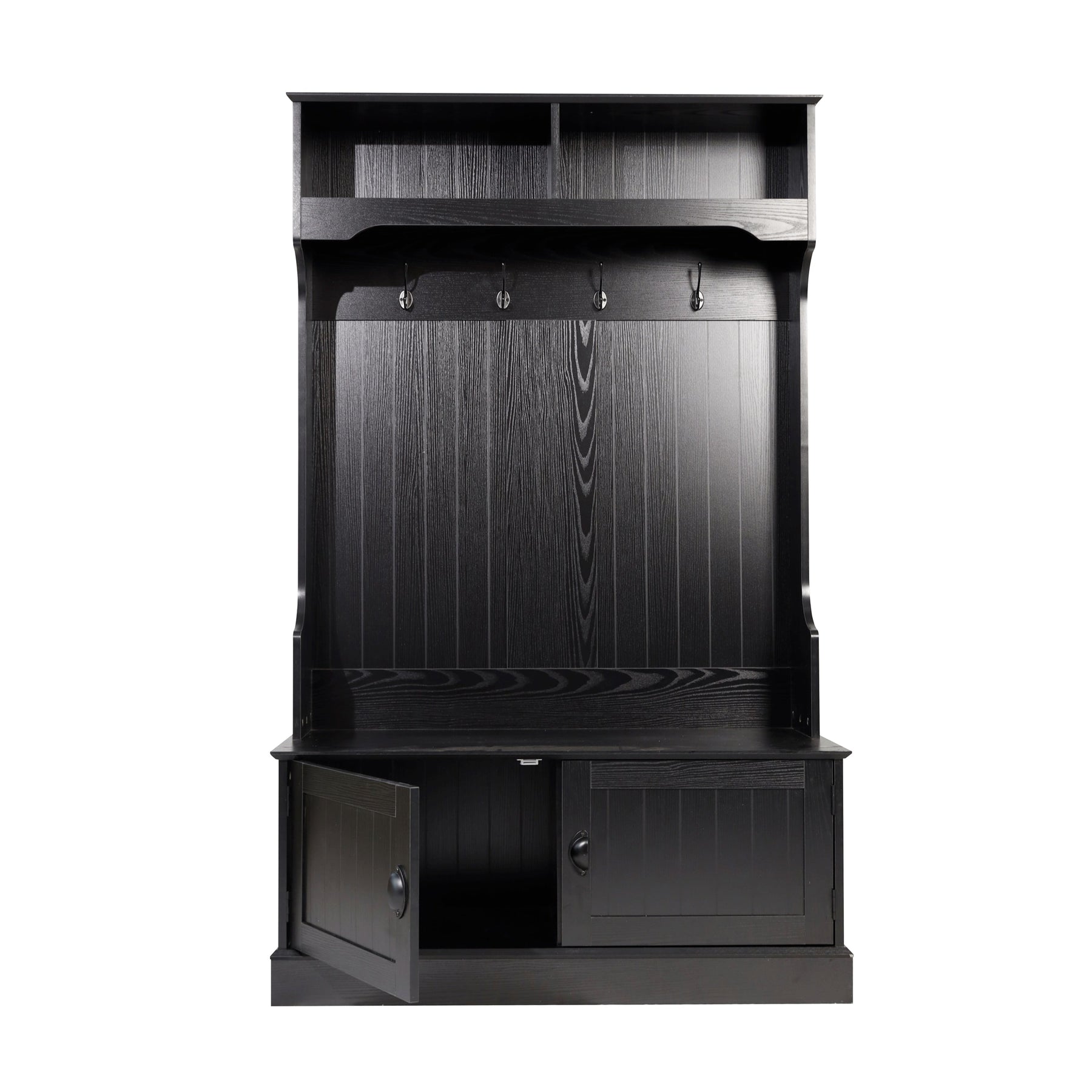 Efficient Organization: Features a bench with storage, upper compartments, and metal double hooks for optimal entryway tidiness.