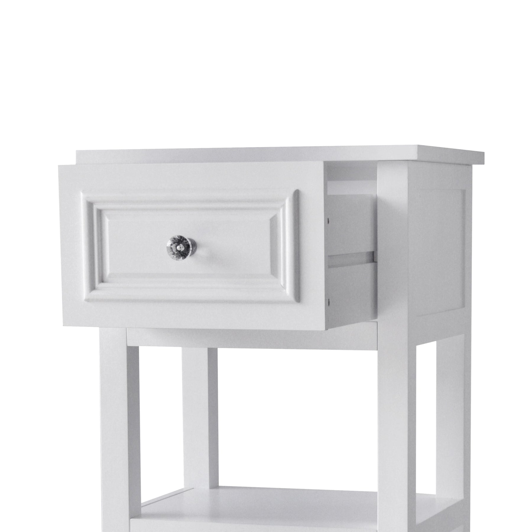 Enhance your space with the Teamson Home Dawson Floor Cabinet, a stylish storage solution. The white cabinet features elegant cross molding and clear knobs, providing both beauty and utility. Its durable engineered wood construction ensures longevity while offering ample storage with a drawer and two shelves, perfect for reducing clutter.