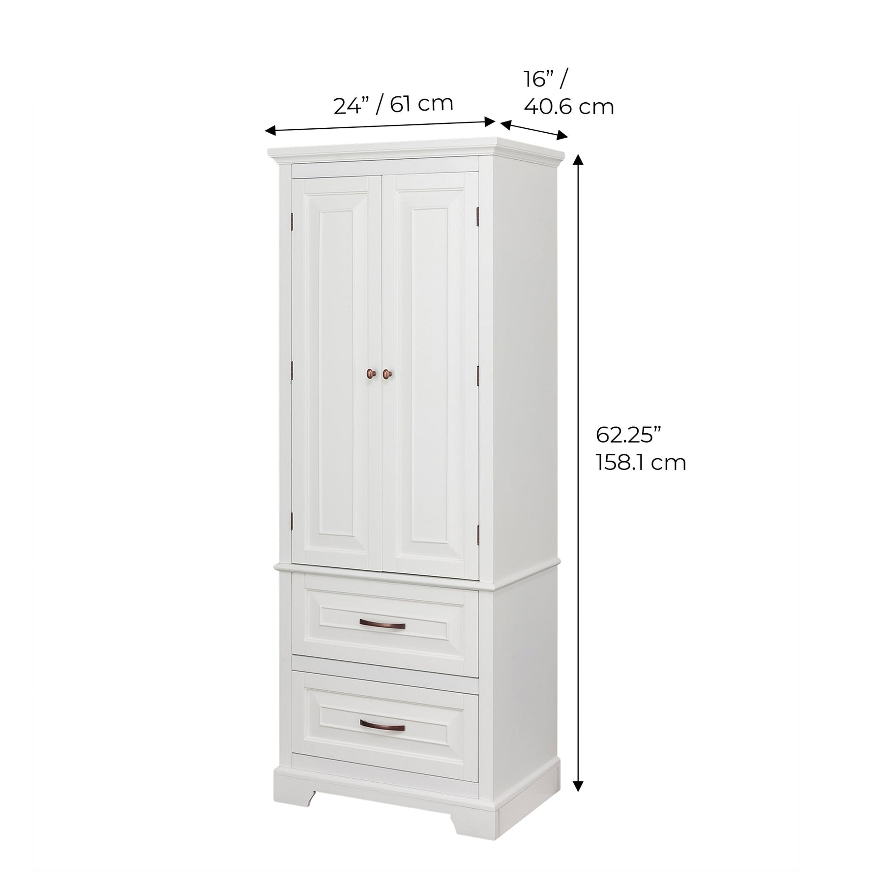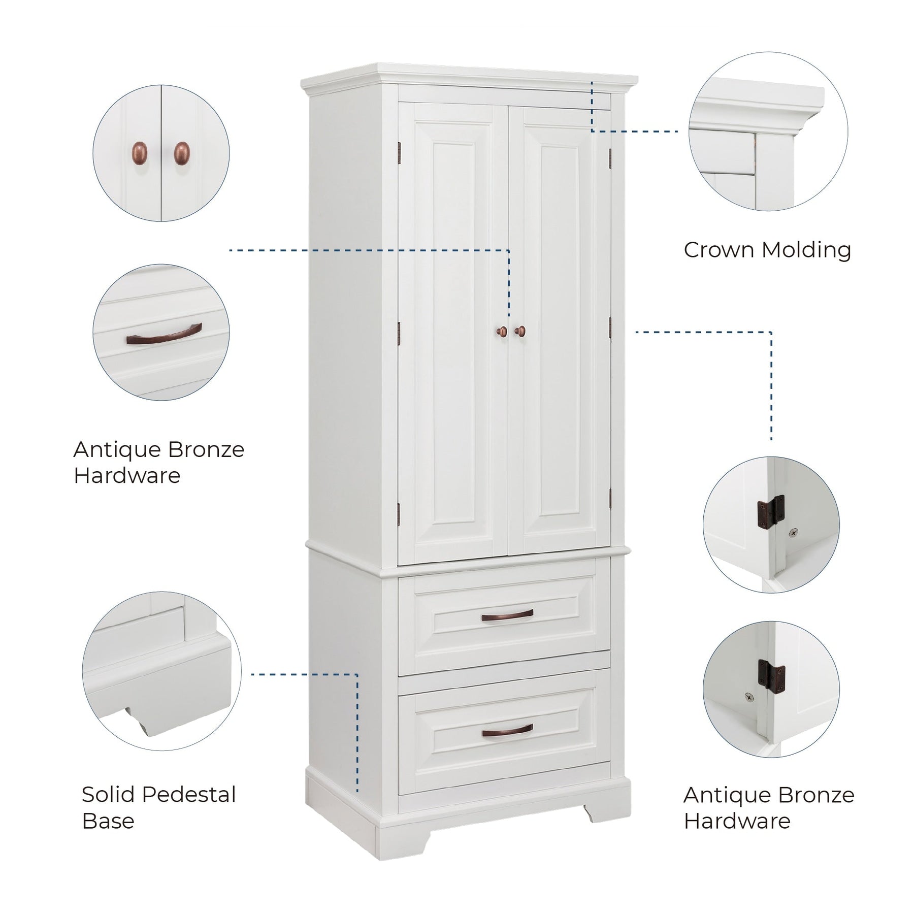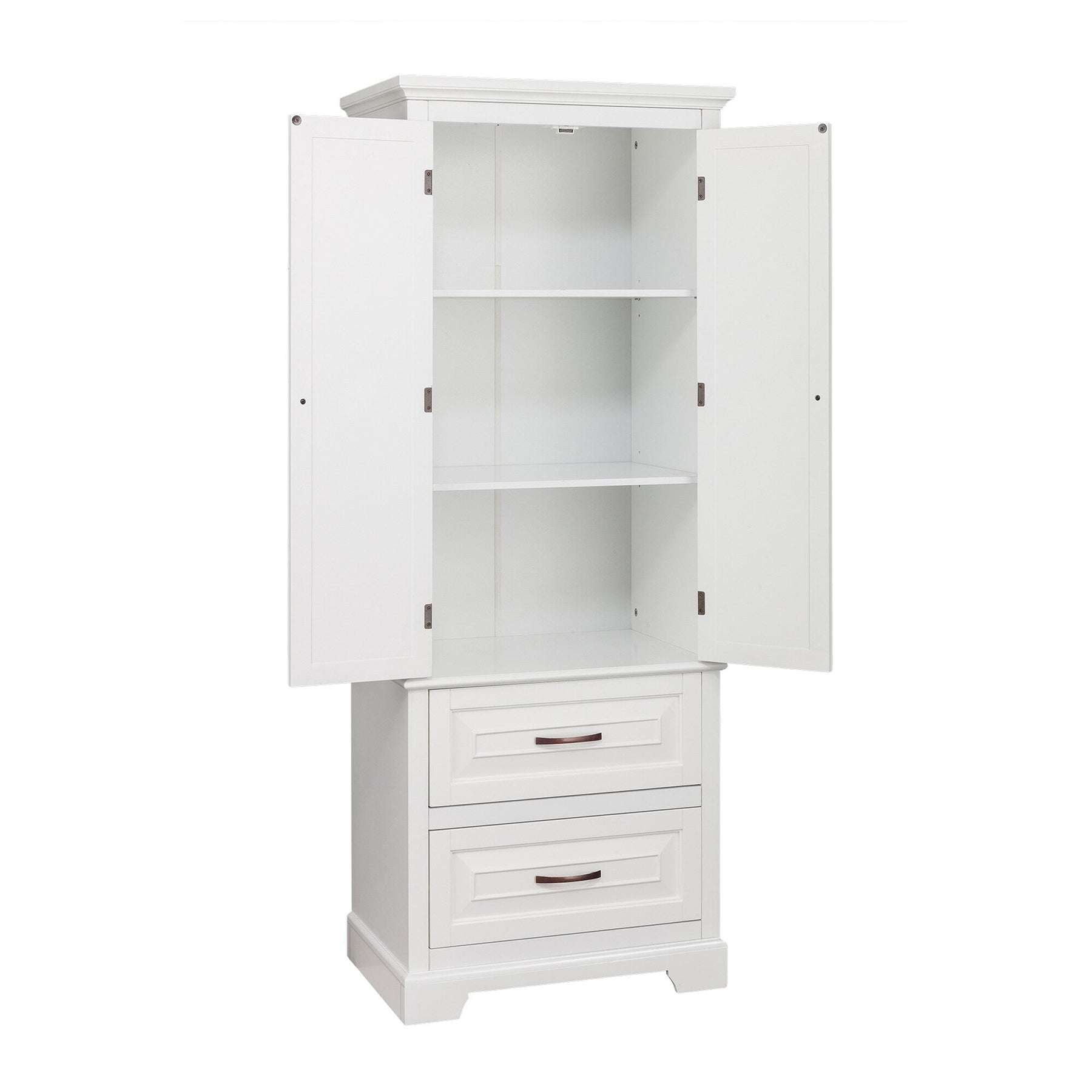 The St. James Freestanding Linen Cabinet by Teamson Home adds a touch of elegance and practicality to any space. Featuring a sleek white finish complemented by brushed bronze handles, it offers ample storage with three adjustable shelves and two drawers crafted from sustainable engineered wood. Perfect for enhancing organizational needs without permanent alterations.