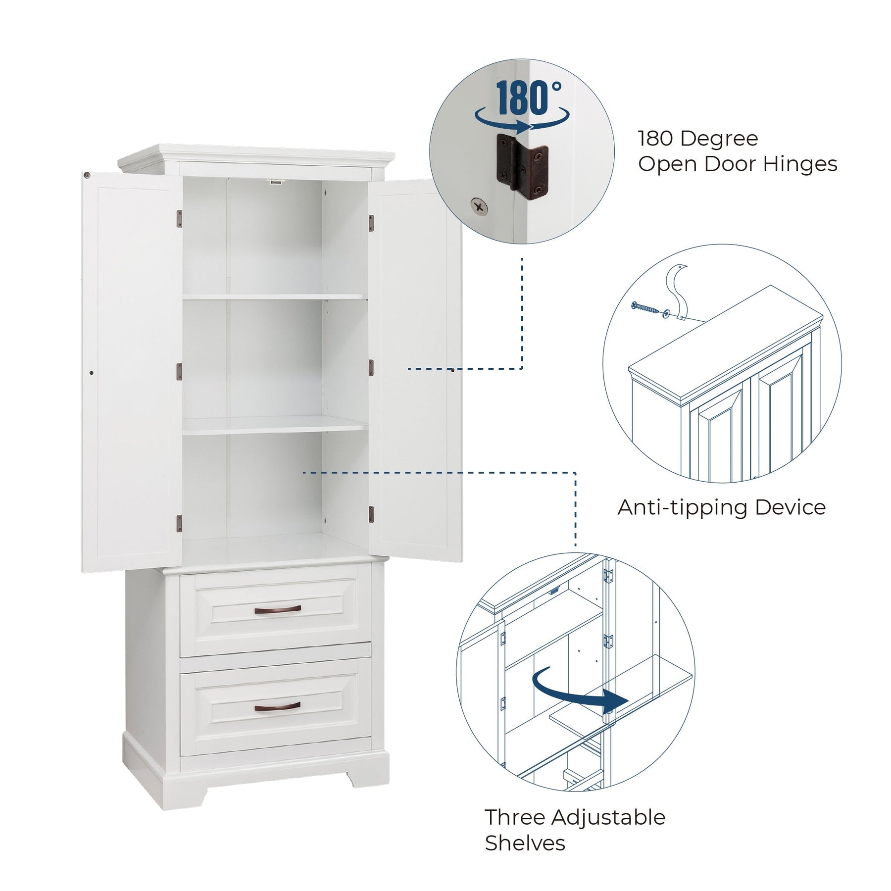 Versatile Storage: Three adjustable shelves and two drawers accommodate diverse storage needs.