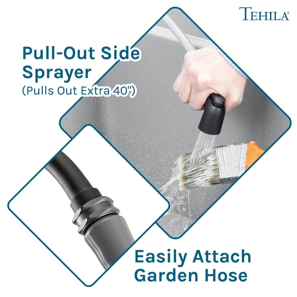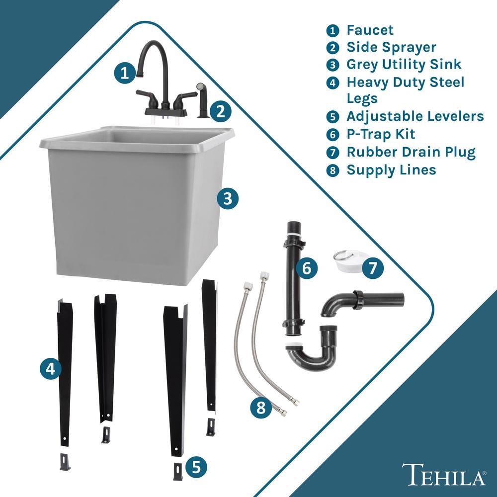 Maximize your workspace with the TEHILA Space Saver Utility Sink. This compact, thermoplastic sink is perfect for tight spots like garages and mudrooms, featuring a durable 13-inch deep basin. Complete with a sleek black faucet and pull-out side sprayer, it’s the ultimate small-space solution for home improvement pros and DIY enthusiasts alike.