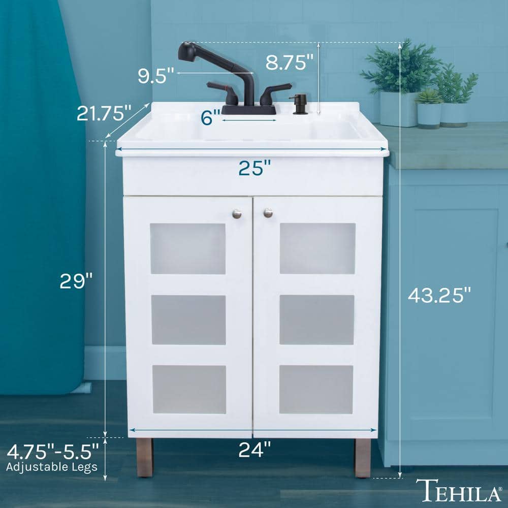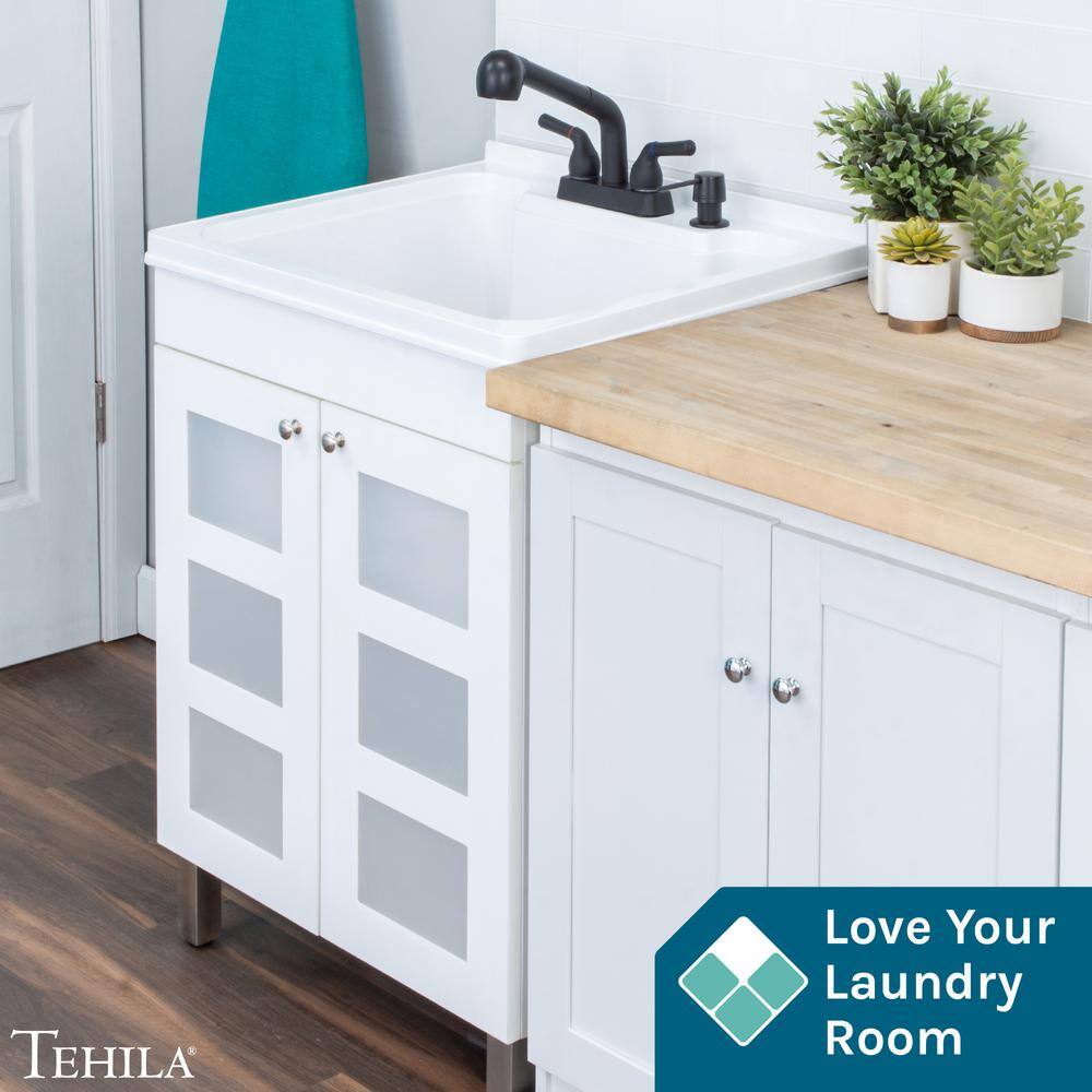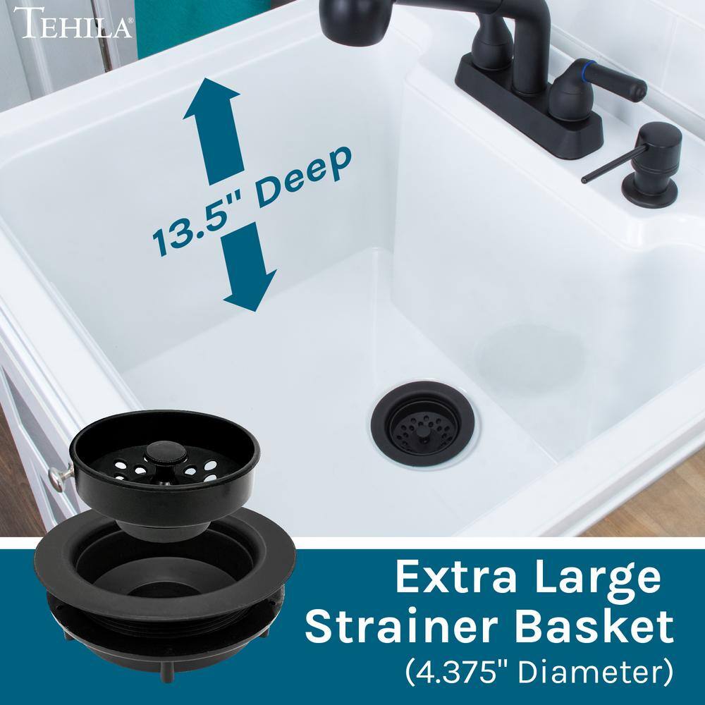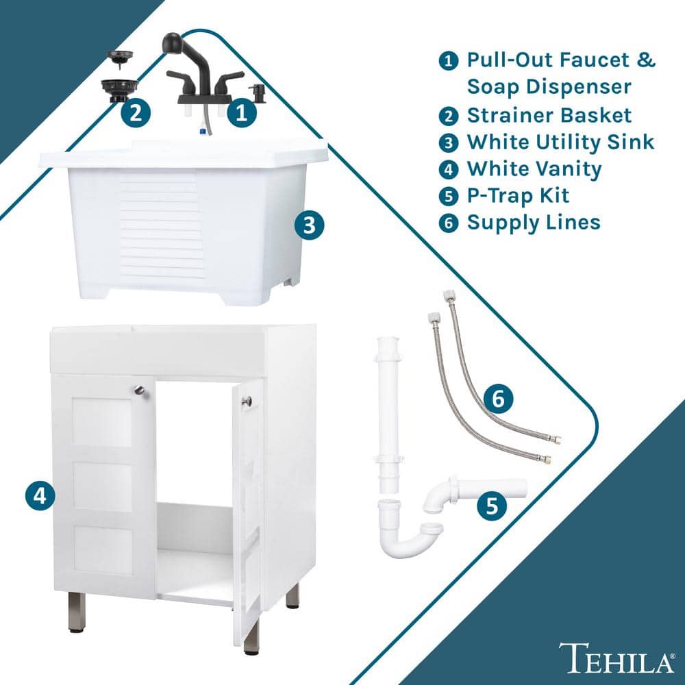 The TEHILA 18 Gallon Laundry Sink with Cabinet effortlessly combines durability and style for any laundry room. Featuring a robust thermoplastic tub and MDF cabinet, it comes fully equipped with a sleek matte black faucet, matching soap dispenser, and ample under-sink storage. Its pre-assembled design and adjustable legs make installation and leveling a breeze.