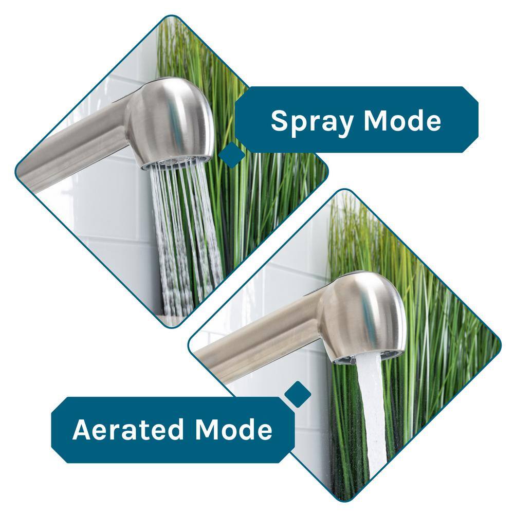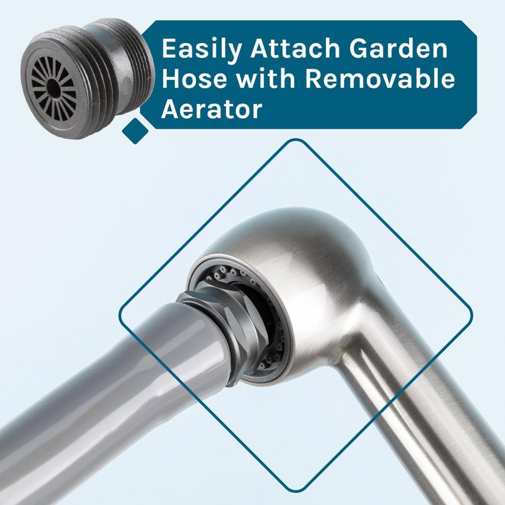 Q: How is the faucet operated? A: The faucet features a dual-function pull-out spray head, allowing both spray and aerated water flows, and is equipped with a removable aerator for hose attachment.