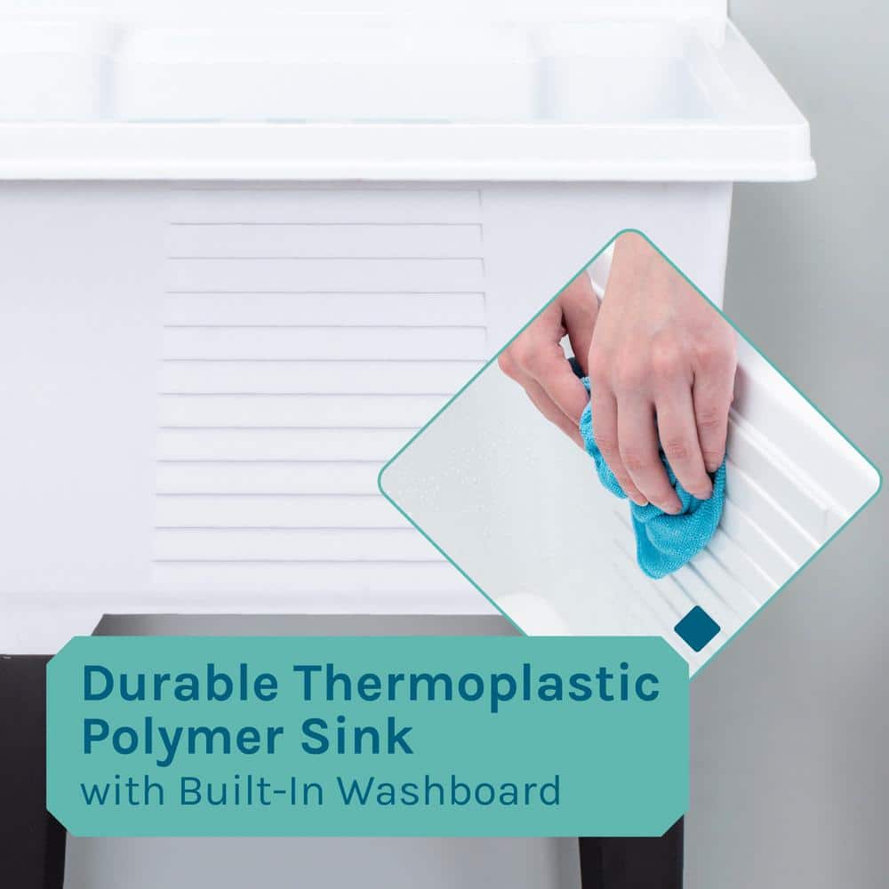 Q: How does the built-in washboard help with cleaning? A: The built-in washboard provides a textured surface within the sink to help efficiently scrub away tough stains on fabrics.