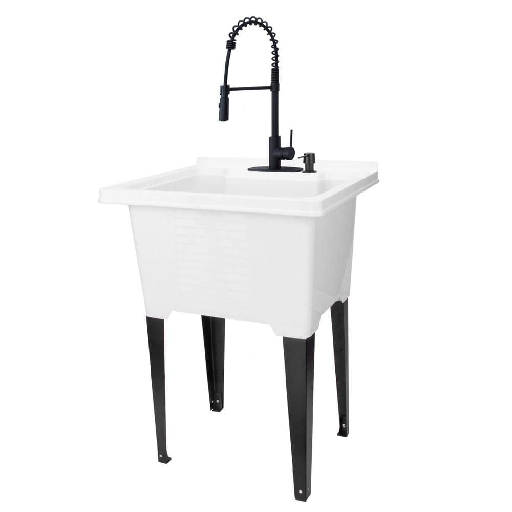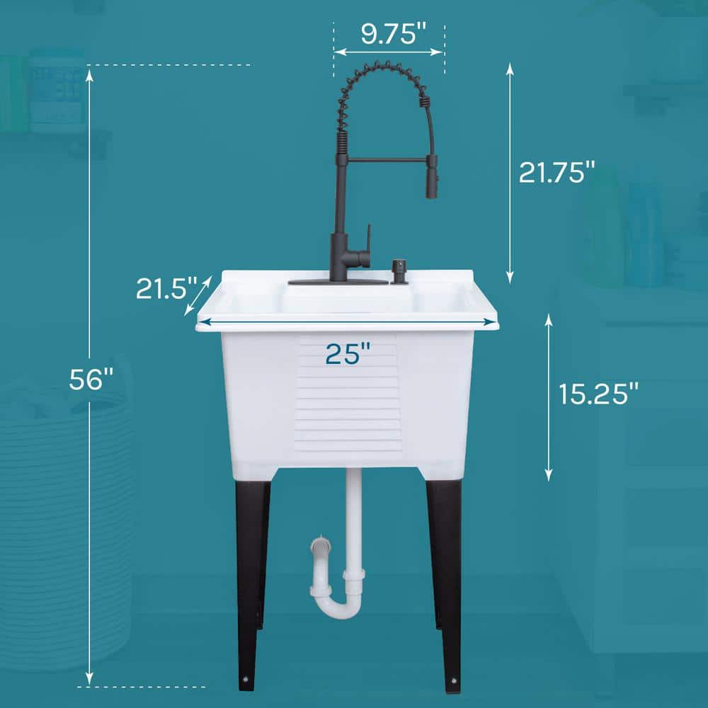 With the TEHILA Freestanding Utility Sink, transform a mundane laundry room into a streamlined oasis of efficiency and style. The juxtaposition of the gleaming white sink against the dramatic matte black coil faucet becomes both a statement piece and a workhorse in your daily chores. Use the built-in washboard not just for textiles, but as an artistic touch that adds texture and flair to the sink. Embrace this utility sink as a hallmark of modern, chic utility rooms where eye-catching design meets high functionality.