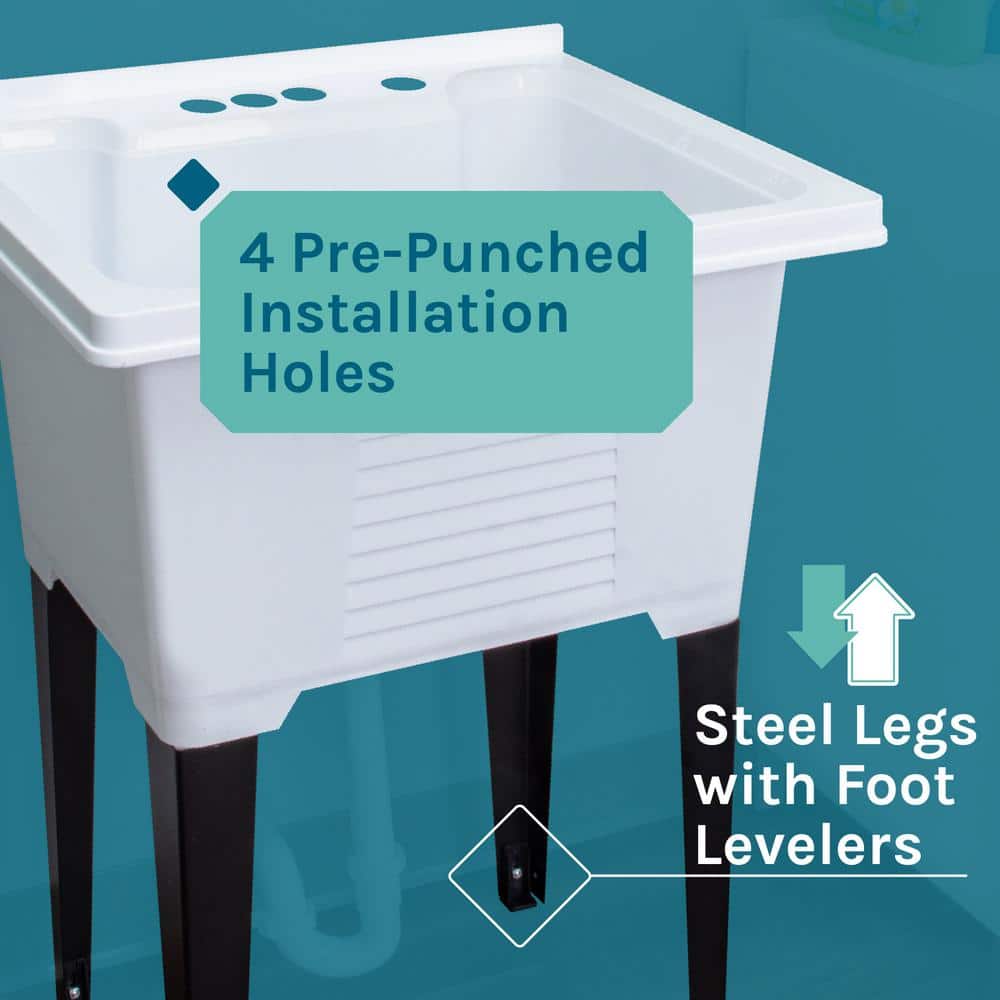 Q: What is the capacity of the sink? A: This utility sink has an 18-gallon capacity, perfect for laundry and utility tasks.