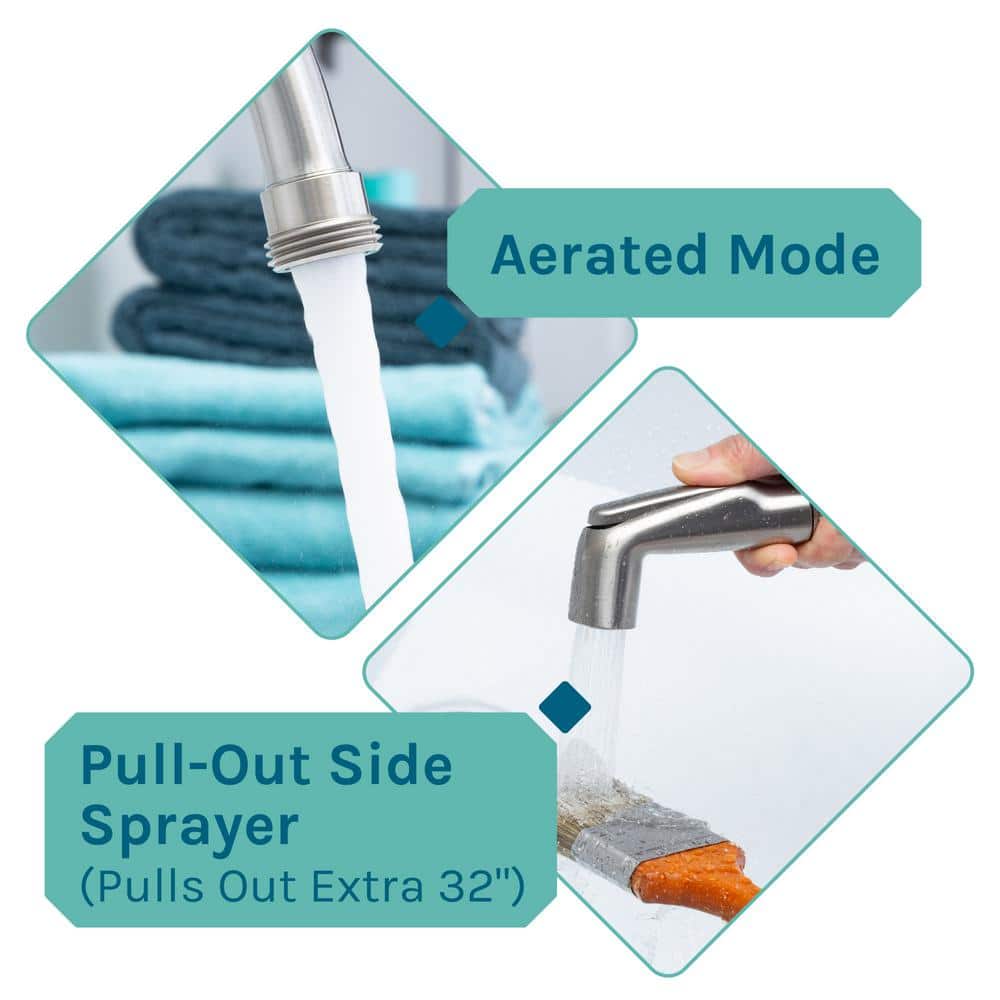 Q: Does the faucet have a good reach for various tasks? A: The gooseneck faucet offers excellent reach, and the side sprayer extends 32 inches for added flexibility and cleaning power.