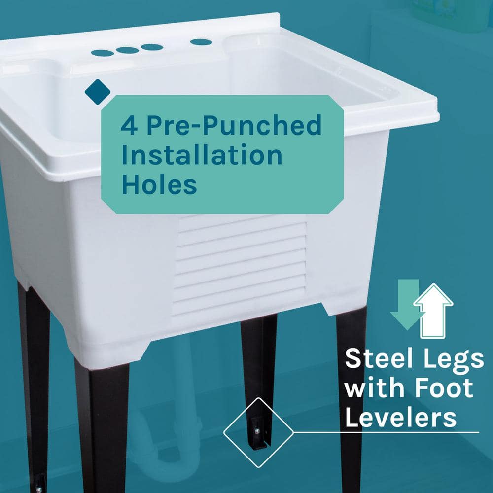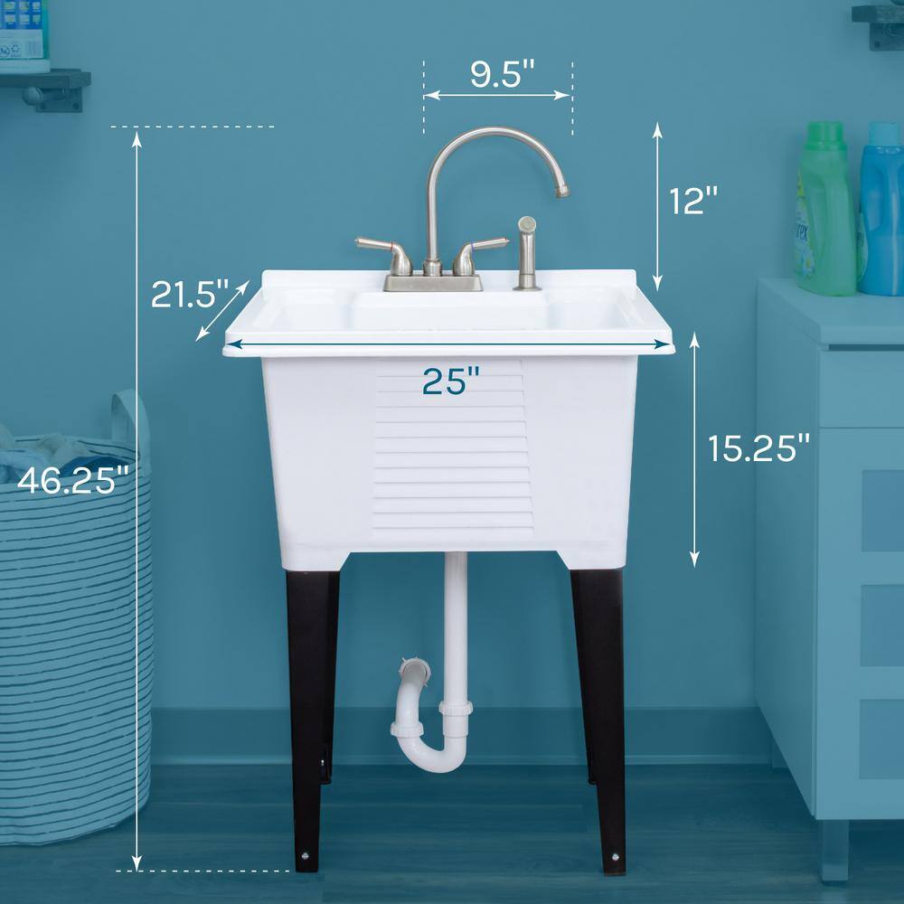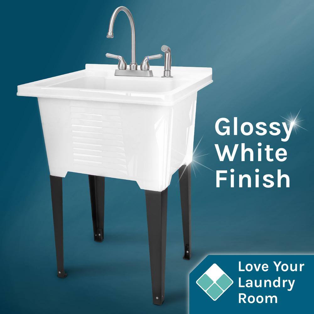 Elevate your utility room with TEHILA's freestanding ABS plastic sink, complete with a sleek stainless gooseneck faucet and side sprayer. The 18-gallon capacity and built-in washboard make it a practical choice for any laundry or basement area, while its sturdy design ensures long-lasting use.