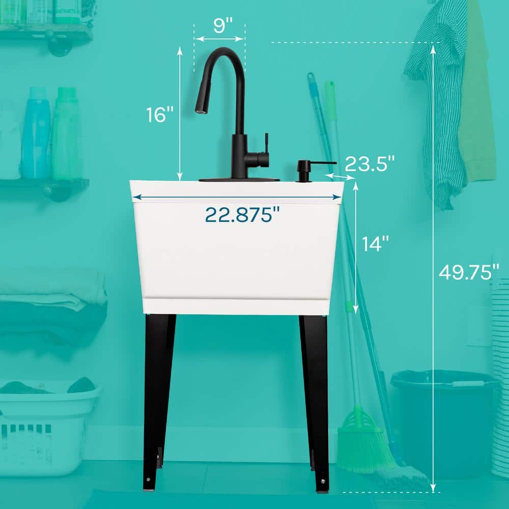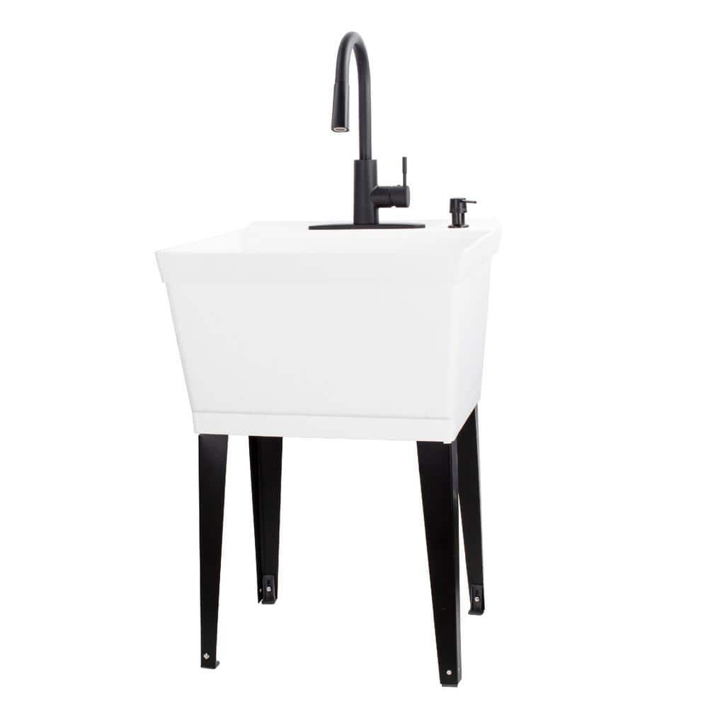 The TEHILA 19 Gal. Utility Sink Set combines durability and style, featuring a thermoplastic basin, black metal hybrid faucet, and matching soap dispenser. This all-in-one laundry solution offers a spacious design with adjustable, rust-proof legs for stability, making it perfect for handling heavy-duty cleaning tasks in style.