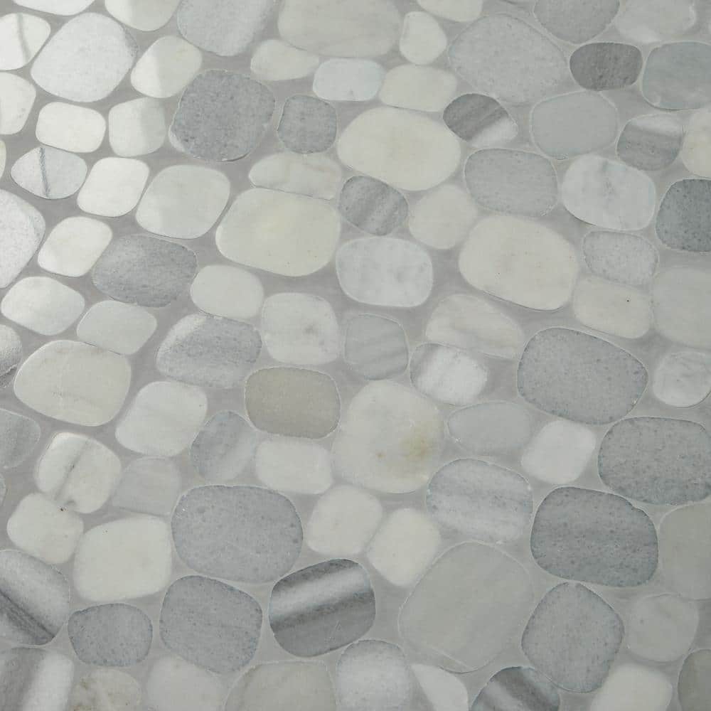 Q: What is the finish and material? A: Unglazed, matte-finish marble pebbles on a mesh backing.