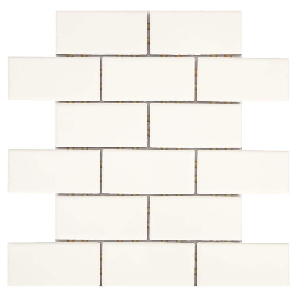 A glossy bright white ceramic mosaic in a classic 2x4 brick-joint pattern, ideal for backsplashes and shower walls. Dot-mounted for consistent grout joints and faster installation, this 12 in. x 12 in. sheet delivers clean, modern style for residential or light commercial spaces.