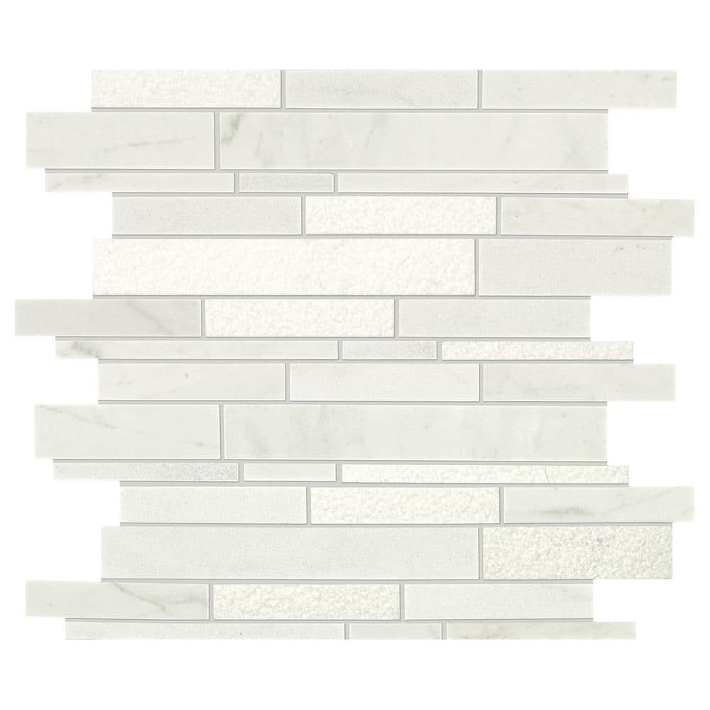 This mosaic whispers luxury with its white marble tones layered in linear rhythm, offering a serene backdrop that brightens any room. The mix of matte and subtly textured pieces adds depth and dimension, catching light with effortless grace. Style it as a continuous backsplash or frame a fireplace surround for a tailored, gallery-like finish. A chic essential for spaces that crave modern elegance and timeless appeal.