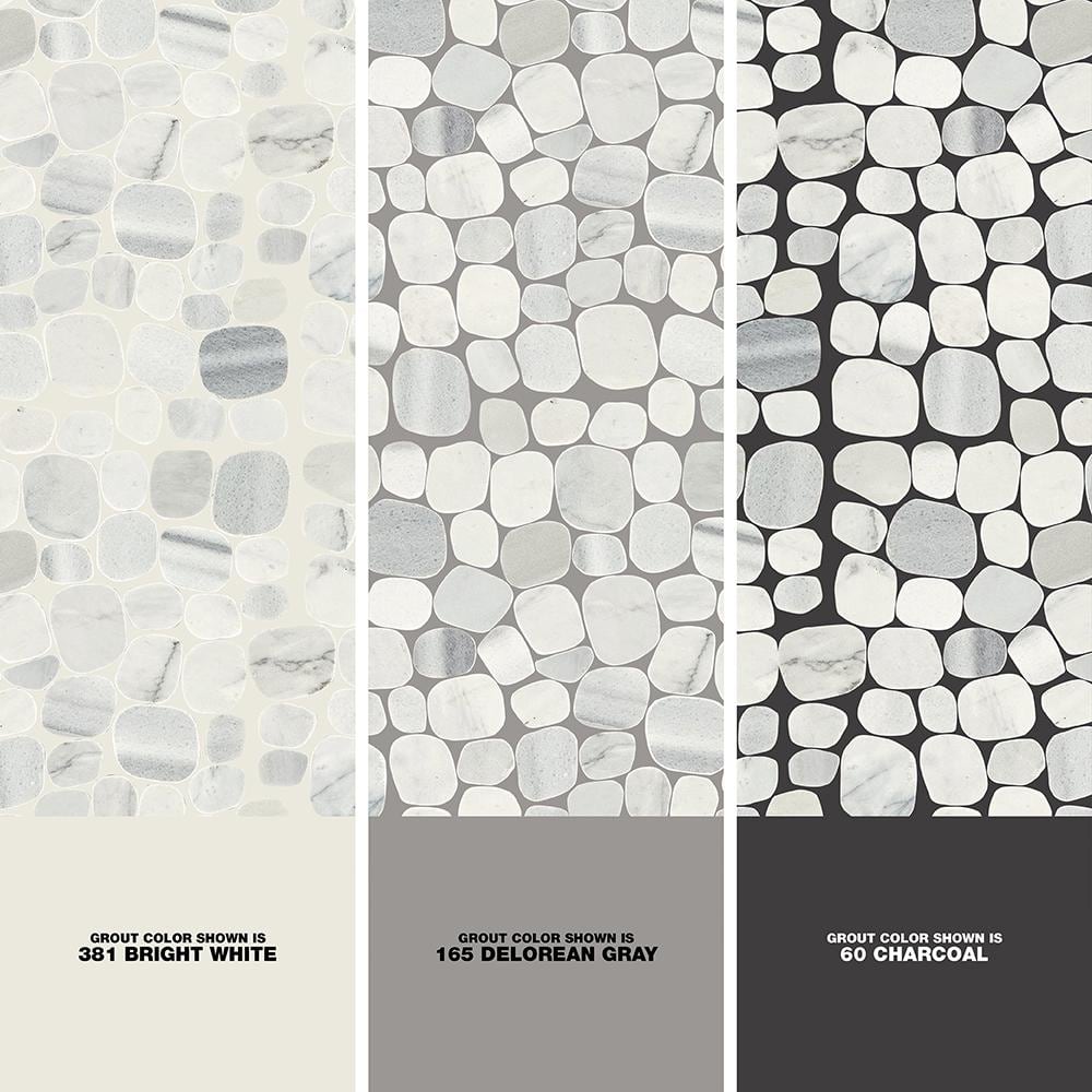 Q: What grout line size should I plan for? A: Suggested grout line is 1/8 in., though random pebble spacing creates irregular grout lines.