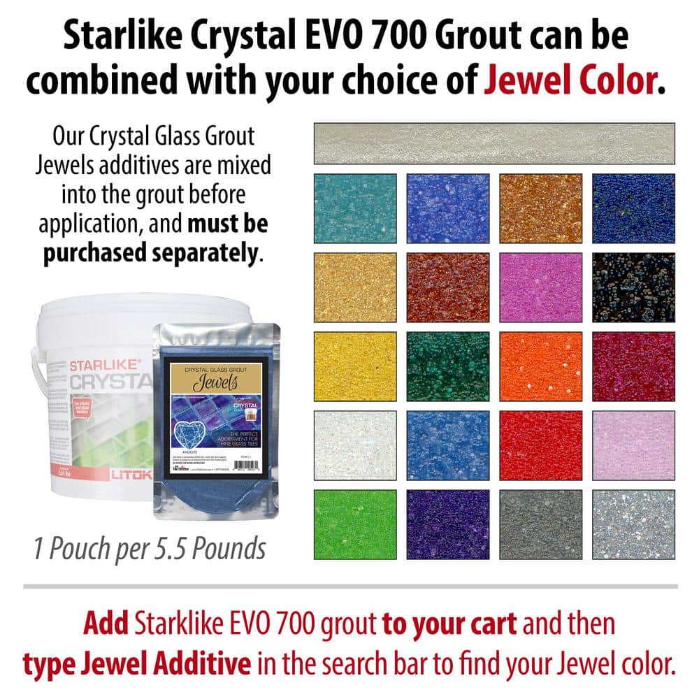 Q: What unique effects can be achieved with this grout? A: Add the Jewels Additive packet to create distinctive jewelry-like effects that enhance the visual appeal of glass tiles.