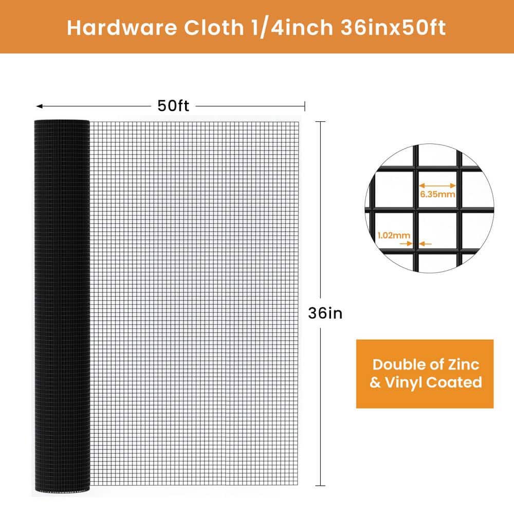 The Tidoin Anti-Rust Hardware Cloth features a durable PVC coating for rust resistance and versatile protection. Ideal for safeguarding gardens, chicken coops, and more, its robust 19-gauge wire and 1/4 inch mesh provides a reliable barrier against pests and predators.