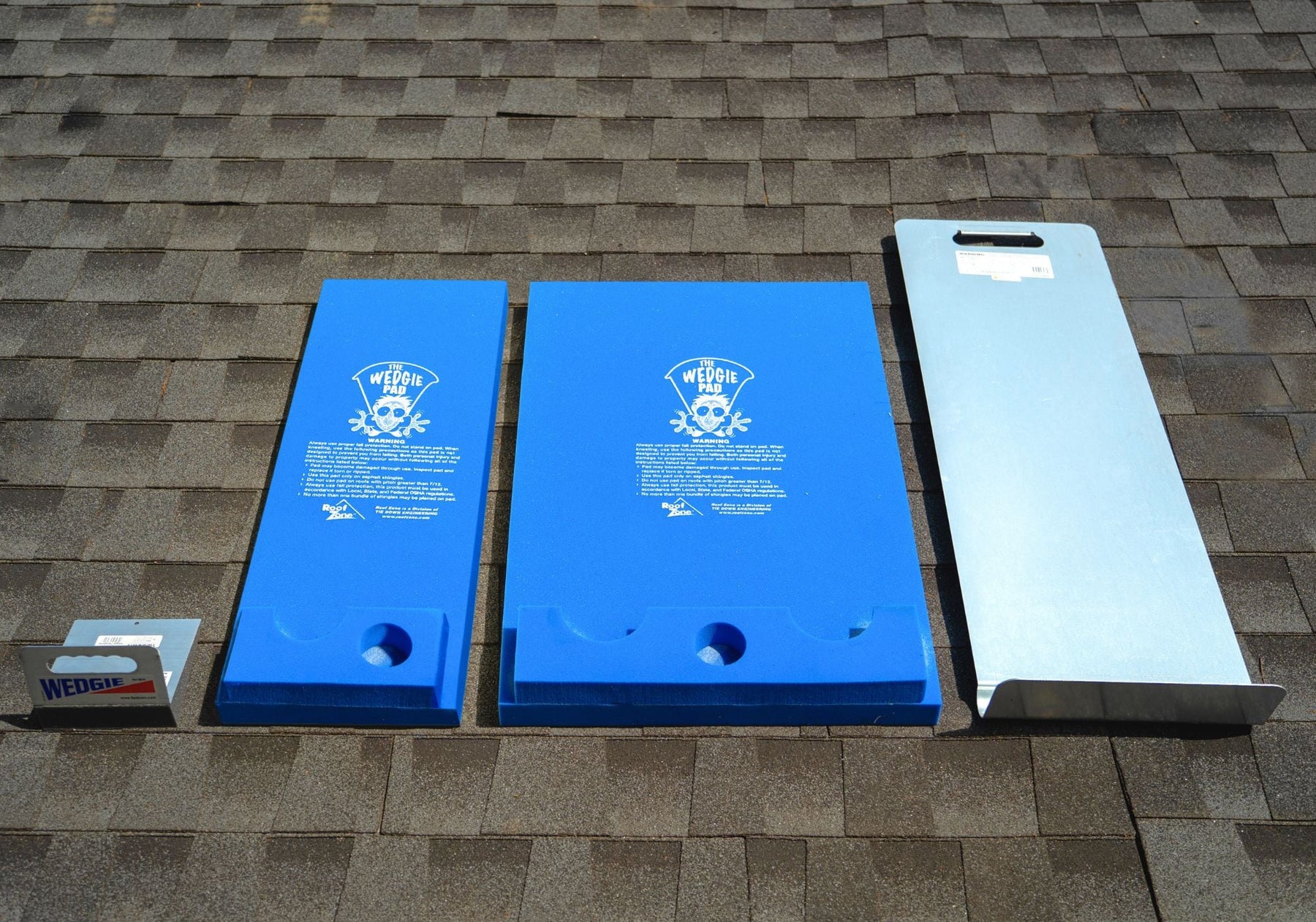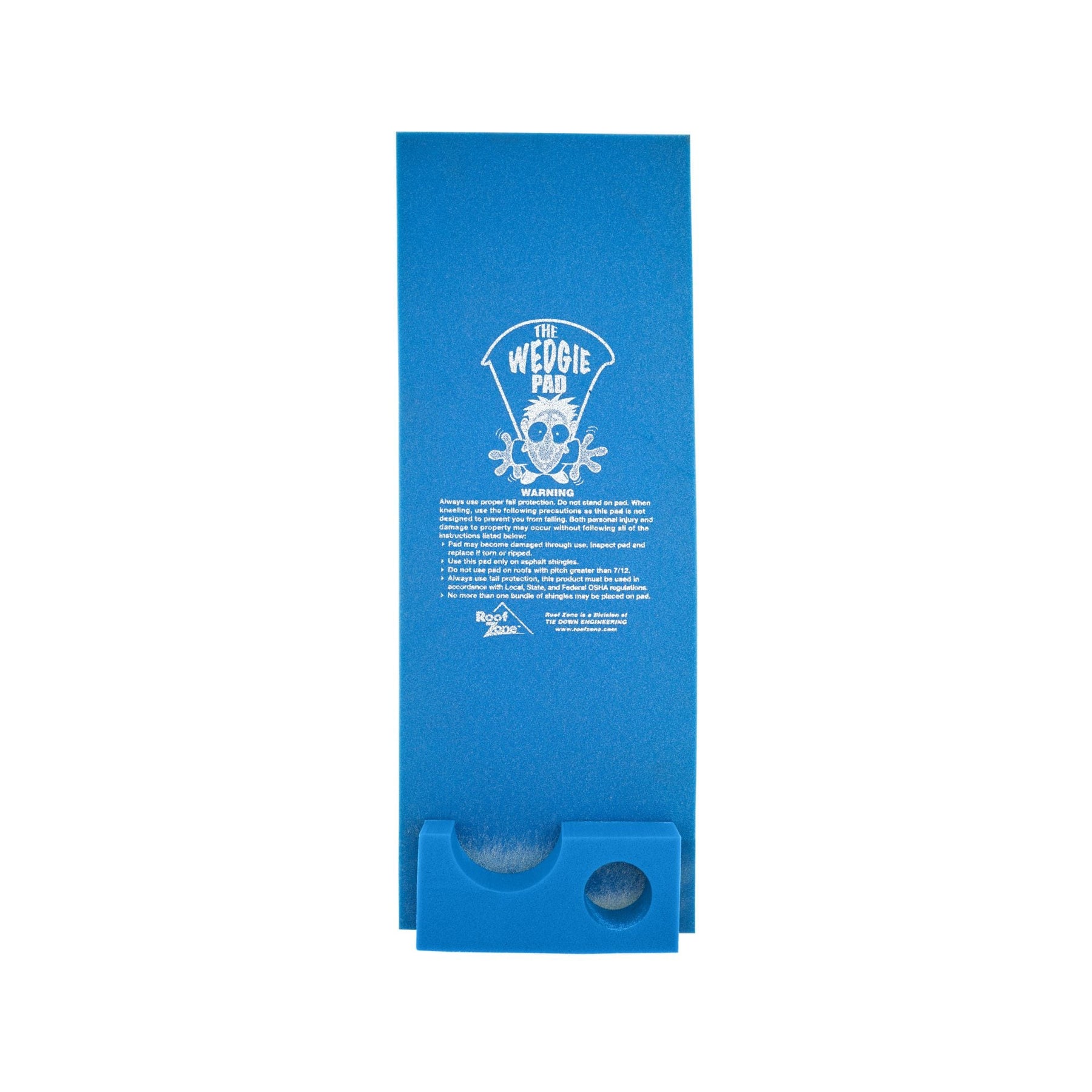 The Tie Down Wedgie Pad Jr. is a 34-inch foam tool holder designed for roofing work. It cushions knees, protects shingles, and keeps materials like asphalt or cedar shingles and small tools organized on the roof.