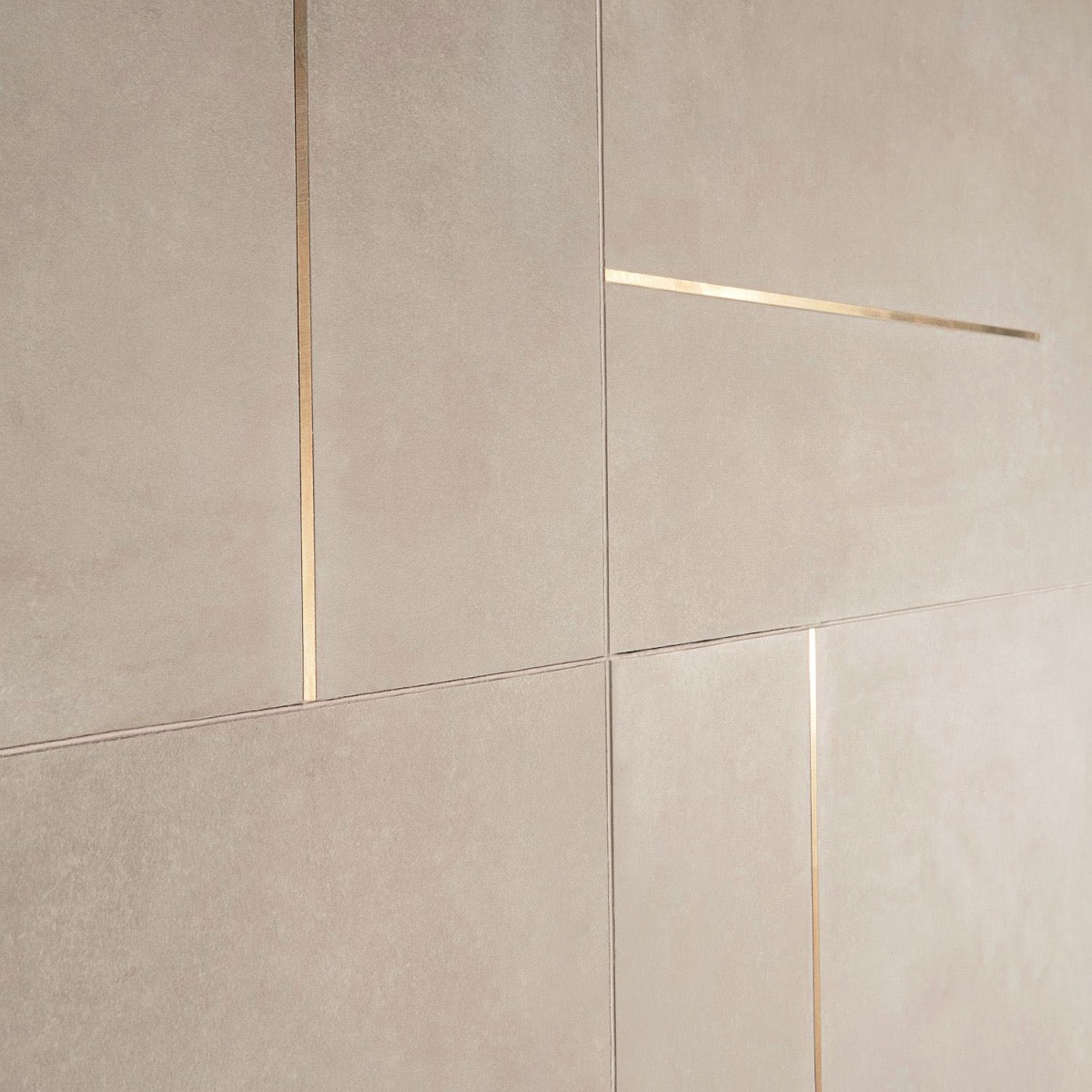 The Lines Brass Inlay Greige tile combines modern industrial aesthetics with luxurious brass accents. Perfect for both residential and commercial spaces, this Italian-made porcelain tile offers durability and style.