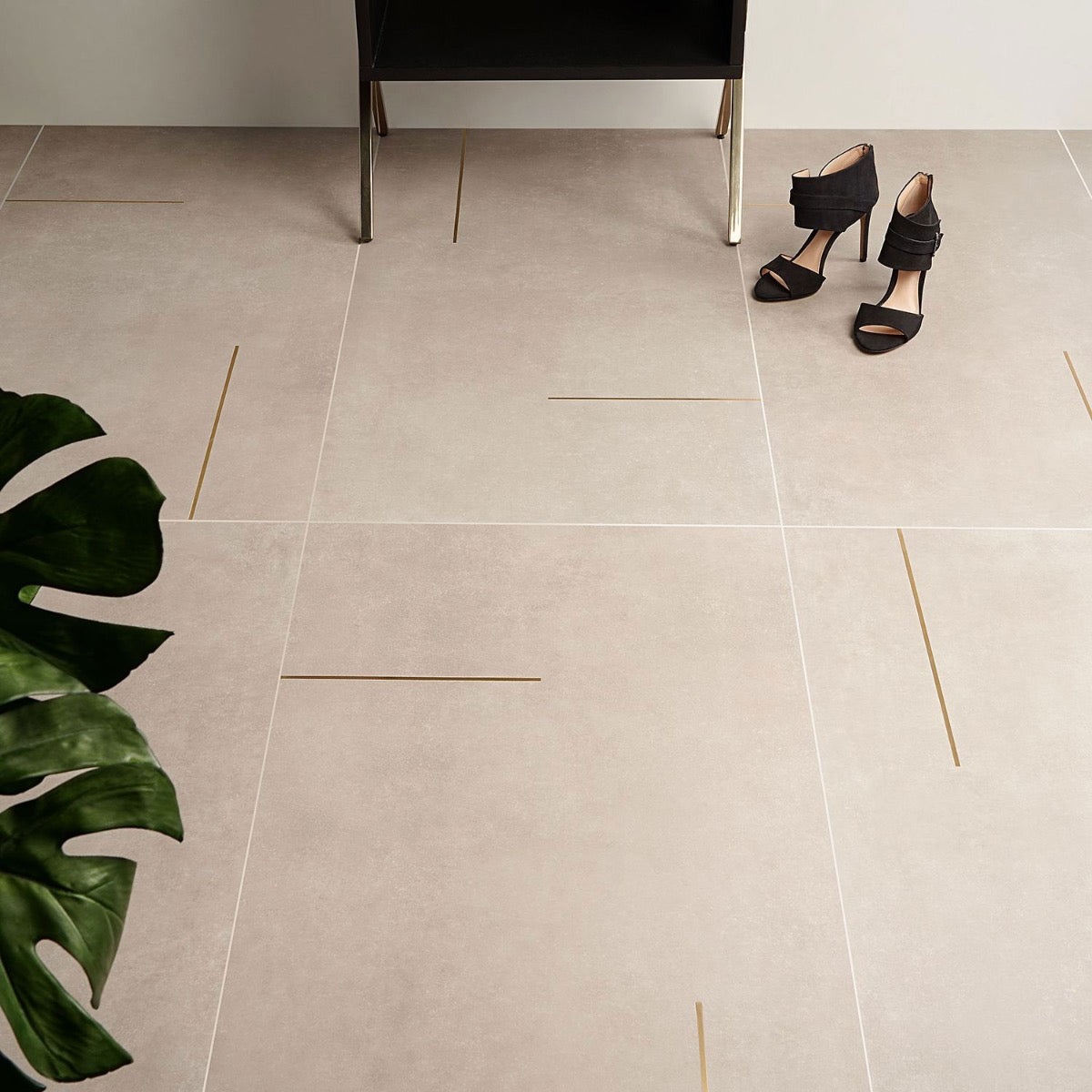 The Lines Brass Inlay Greige tile is a masterpiece of modern design, blending industrial chic with luxurious brass accents. Its matte finish and concrete look create a sophisticated backdrop, while the brass inlays add a touch of opulence. Perfect for creating a statement wall or a seamless floor, this tile transforms any space into a haven of contemporary elegance. Essential for those who seek to infuse their interiors with a blend of durability and style.