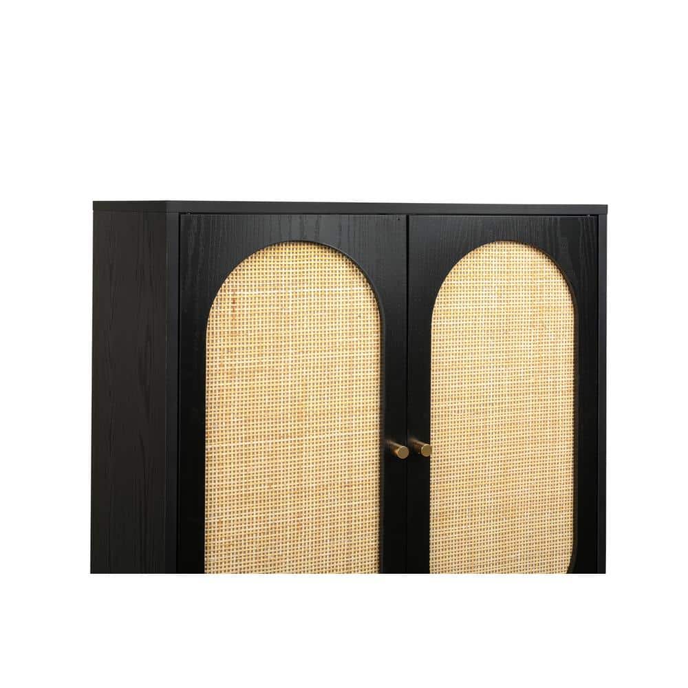 Elevate your home's storage with Tileon's sleek Black Wood Freestanding Kitchen Cabinet. This versatile, MDF cabinet combines rustic rattan with contemporary design elements, offering both style and functional storage solutions for any room in your home.