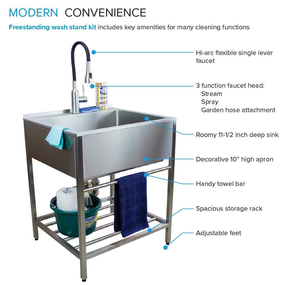 Transform your laundry room or garage into a multifunctional workspace with the Transolid Stainless Steel Apron-Front Utility Sink. Constructed from durable 18-gauge stainless steel, this freestanding sink offers robust utility with a stylish brushed satin finish. The included high-arc faucet and extra storage provide both convenience and efficiency.