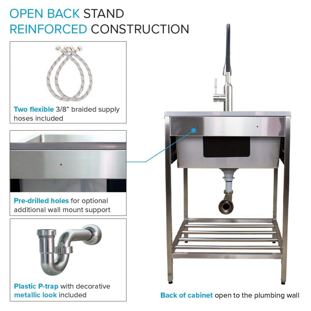 Q: What are the dimensions of the sink and stand? A: The utility sink measures 25 inches in width, 22 inches in depth, and 34.3 inches in height; perfect for accommodating large items.