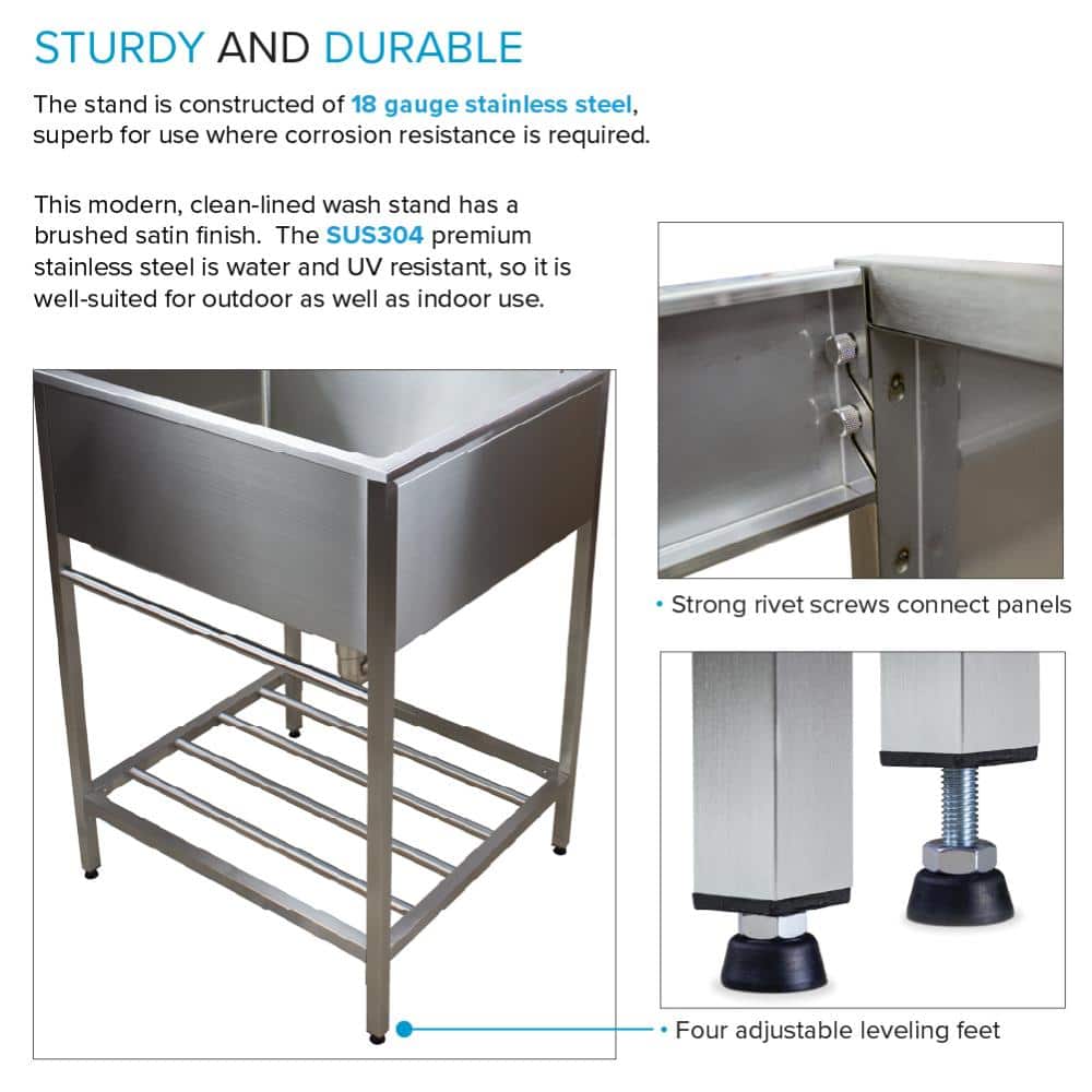 Q: Is this sink suitable for outdoor use? A: Yes, the stainless steel construction provides excellent durability, making it suitable for outdoor settings as well as garages and laundry rooms.