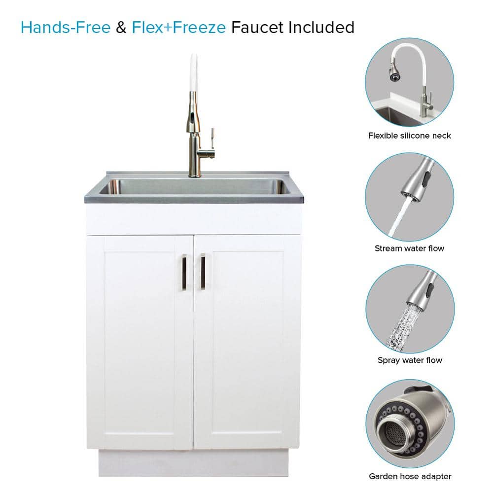 All-in-One Kit: Includes cabinet with hardware, handmade 19-gauge stainless steel sink, and Flex+Freeze faucet.