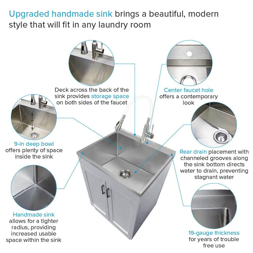 Q: Can the sink and cabinet handle heavy-duty use? A: Yes, the 19-gauge stainless steel sink and robust cabinet are built to withstand rigorous use, ideal for laundry and utility purposes.