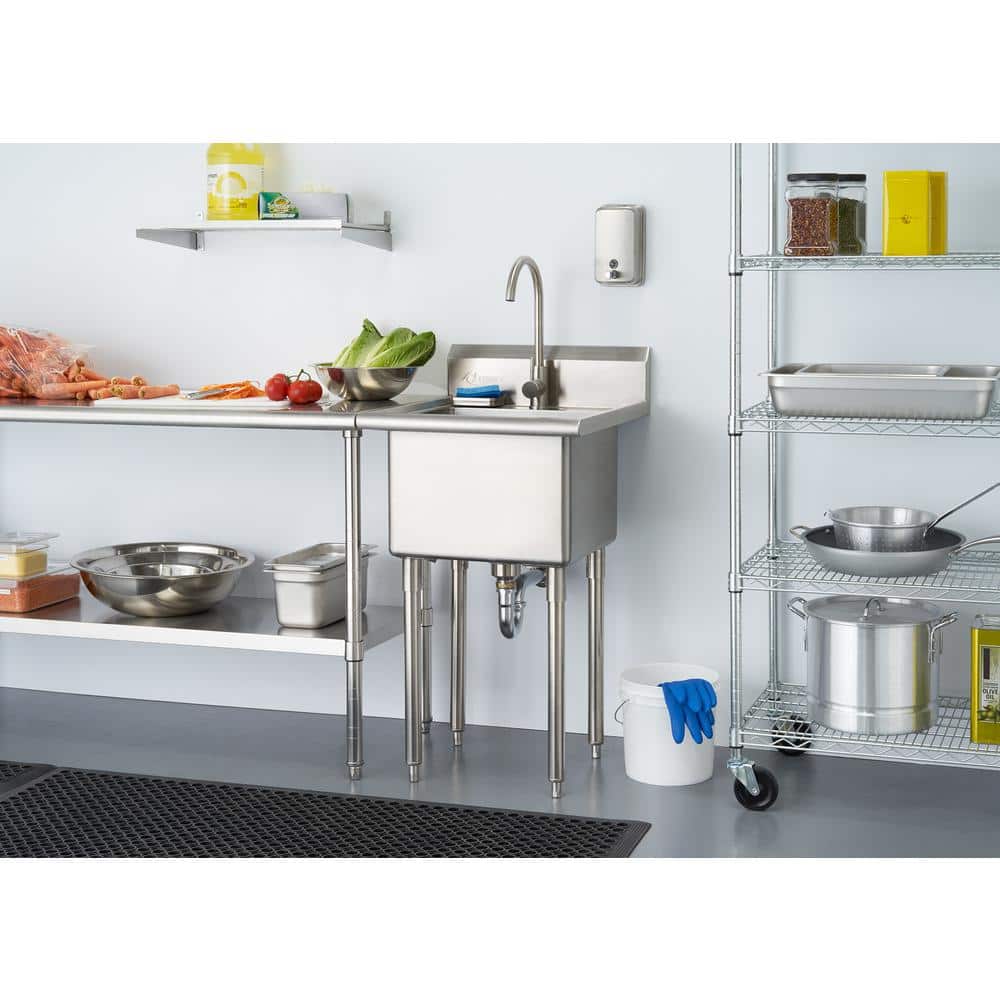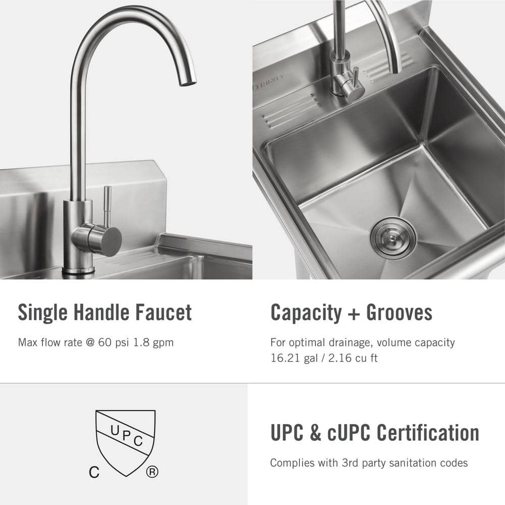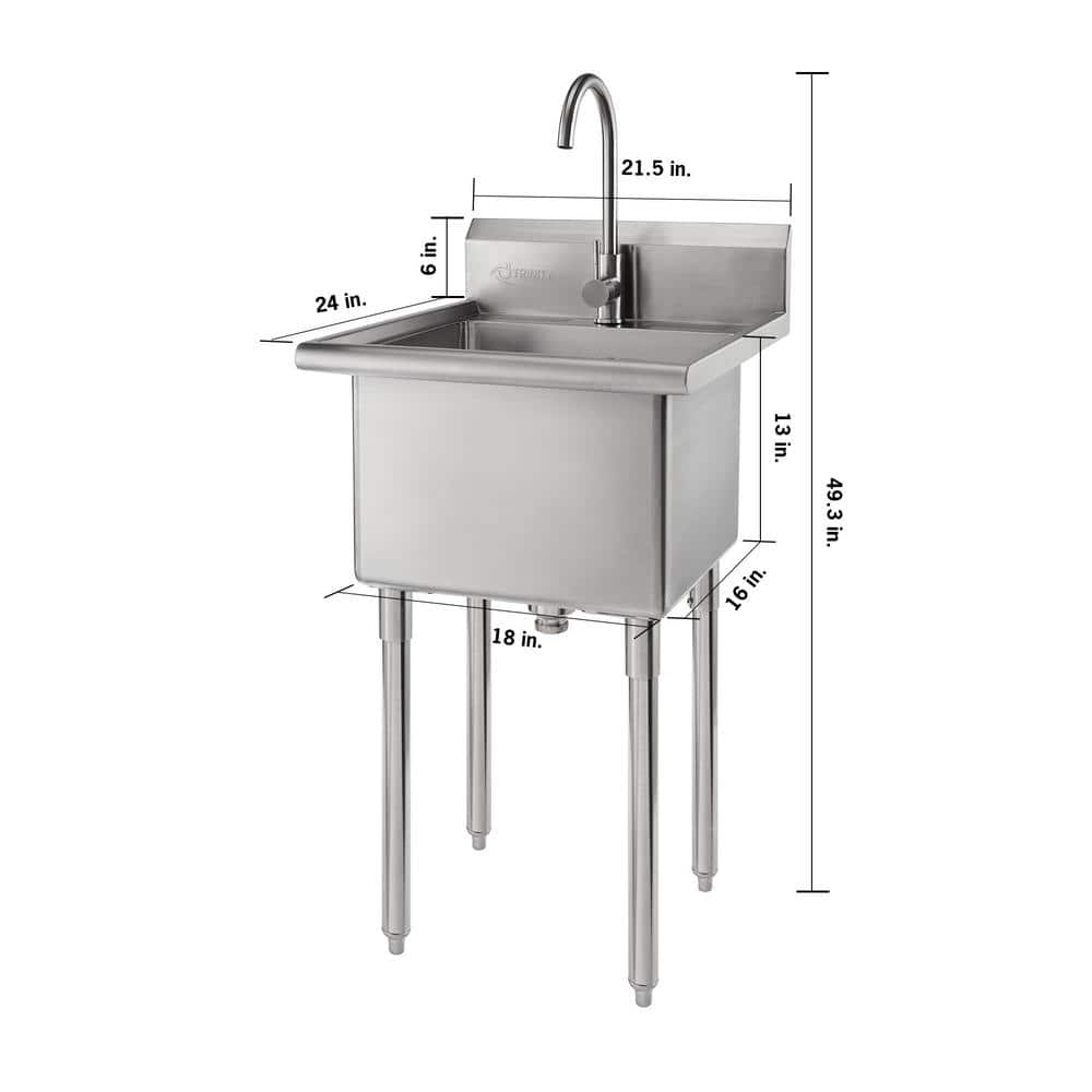 The TRINITY 21.5 in. Stainless Steel Utility Sink is designed for ultimate durability and versatility, perfect for professional and home use. Constructed with 16-gauge, 304 stainless steel, it features an NSF certification for supreme hygienic performance. Ideal for kitchens, laundry, or garages, this sink includes a 6" backsplash, adjustable feet levelers, anti-tipping hardware, and a sleek single-handle faucet.