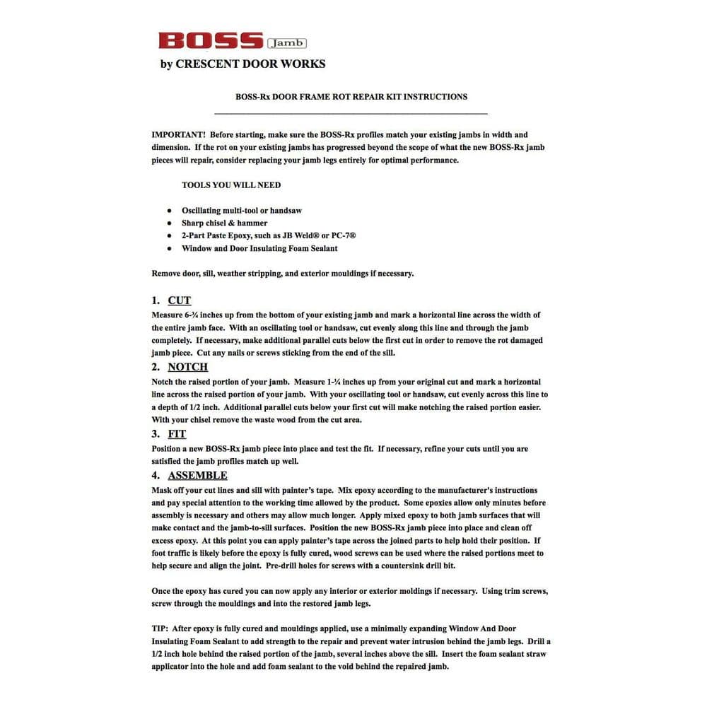 Q: How easy is the installation process for the BOSS-Rx PVC Door Jamb Repair Kit? A: Installation is straightforward thanks to lap joints and 5° sill cuts, designed to accommodate imperfect cuts. Detailed instructions guide you through the process.