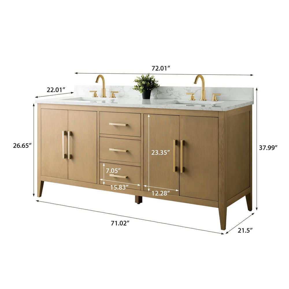 Vanity Art 72 in. W x 22 in. D x 34 in. H Double-Sink Bathroom Vanity in Natural Oak with Engineered Marble Top in Arabescato White