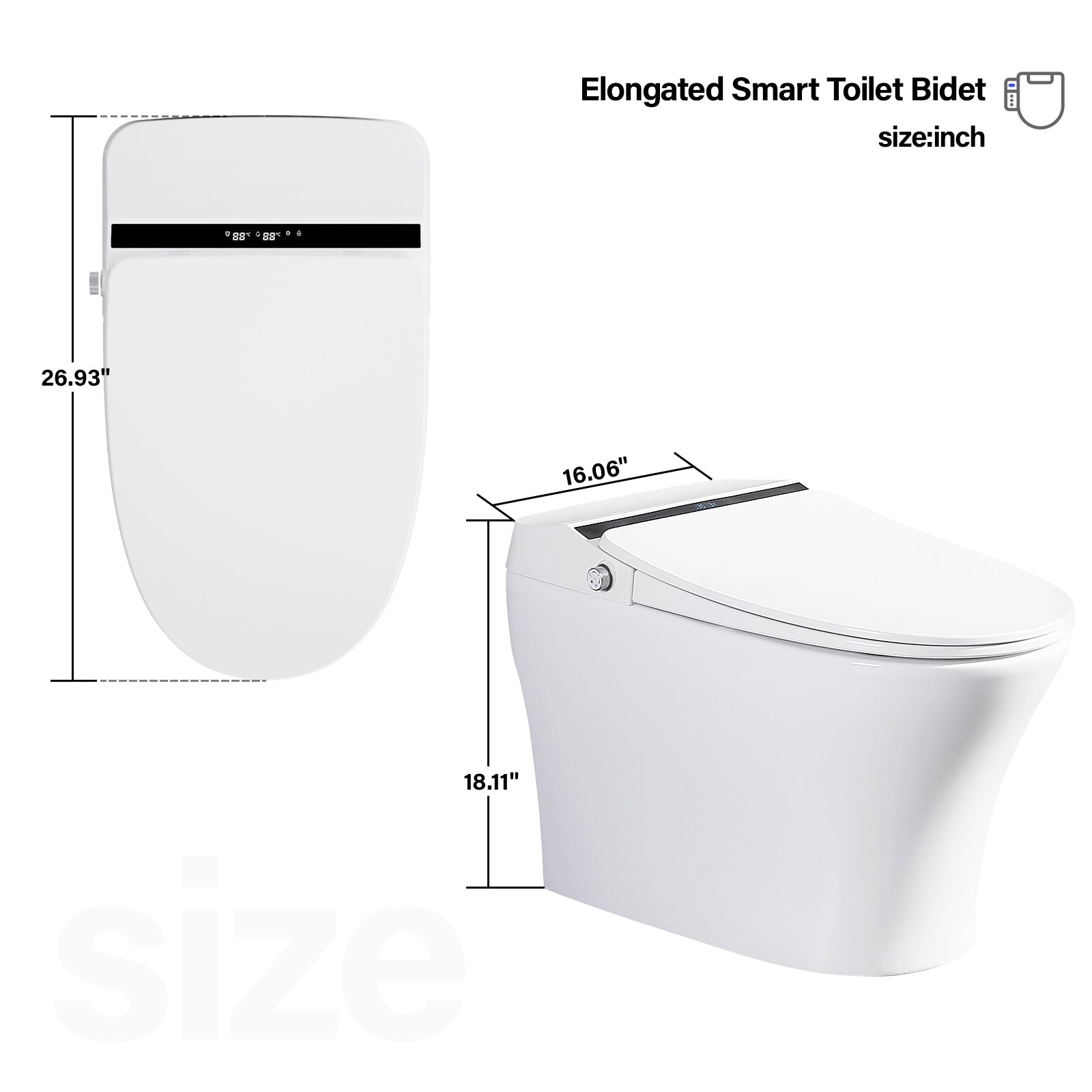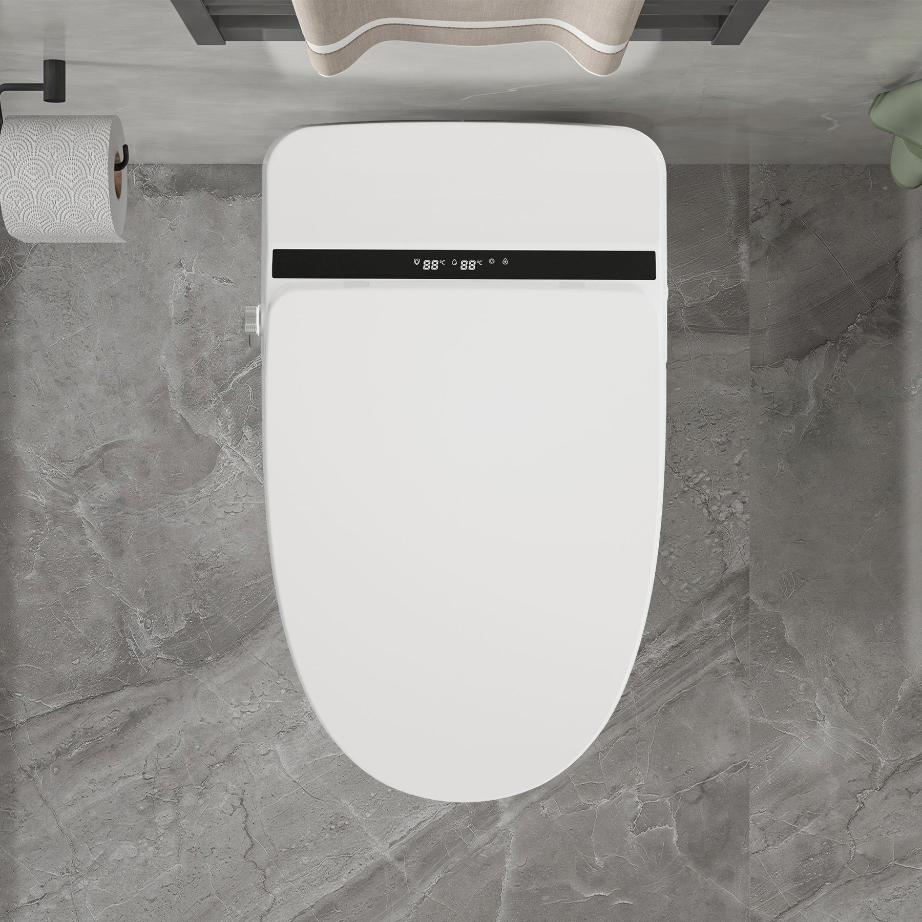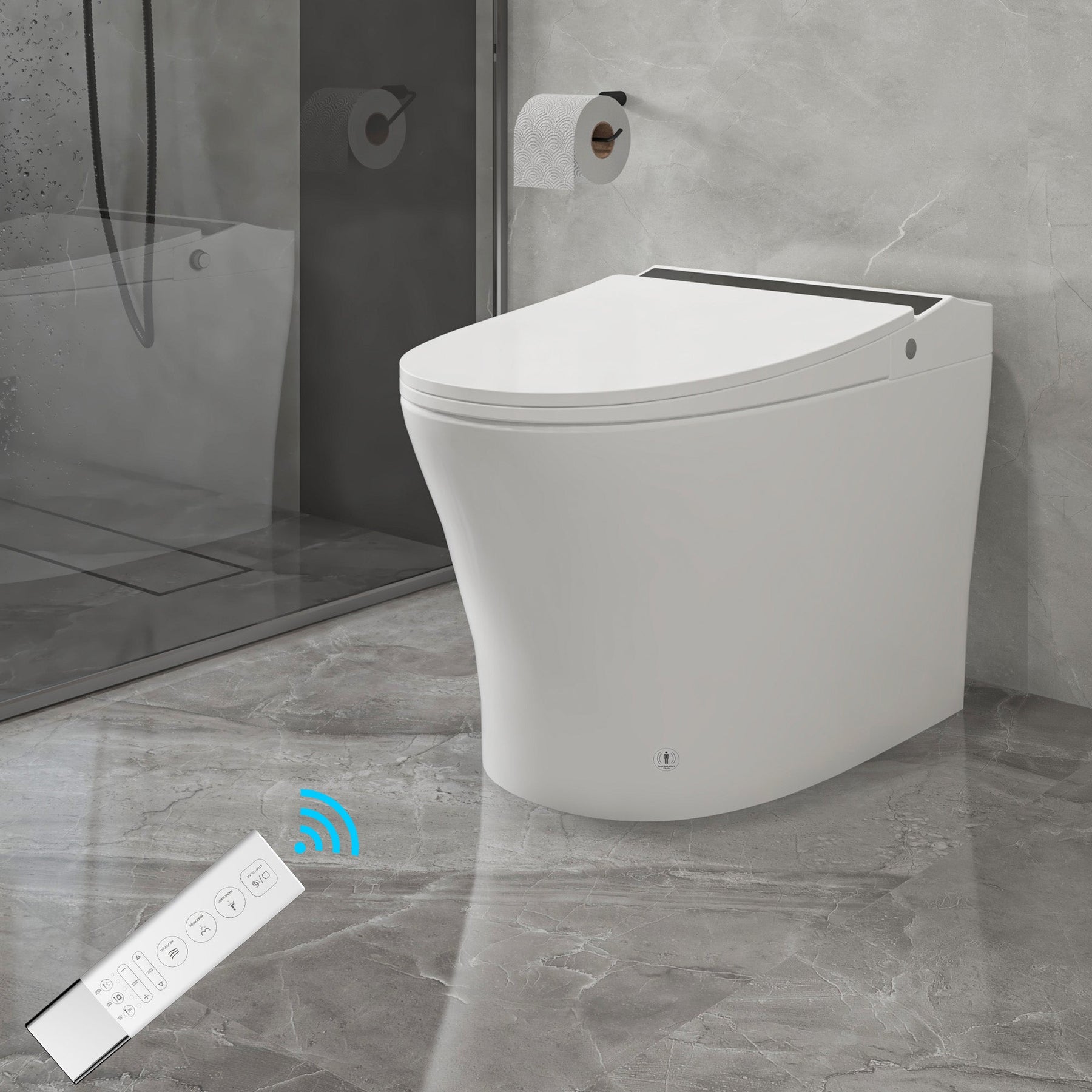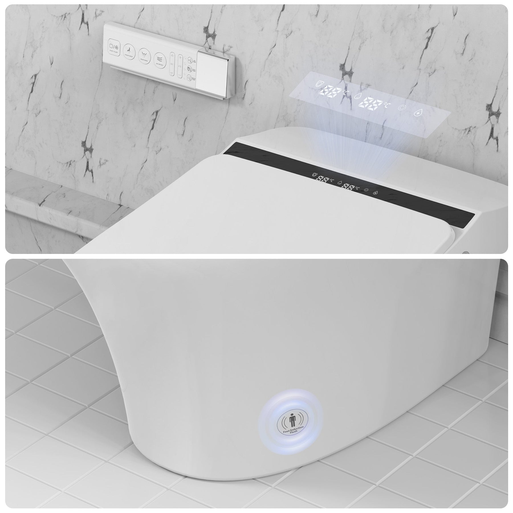 A modern 1-piece smart toilet that blends sleek style with advanced hygiene and comfort. Features an elongated bowl, auto flush, heated seat, front/rear wash, air drying, and an intuitive remote with LED display.